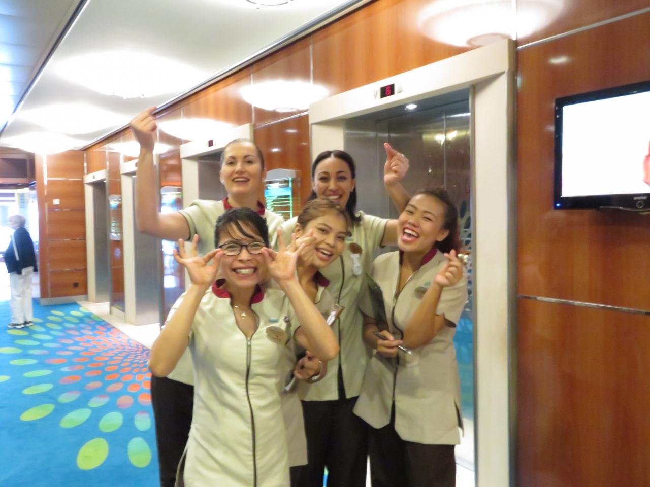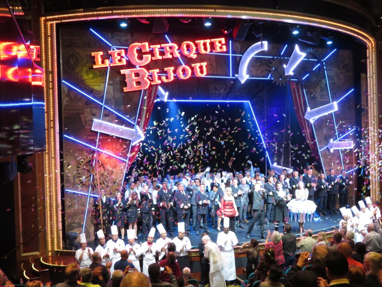 クルーズ18日目の夜には各部門のクルーが勢揃いし盛大なお別れパーティ。乗船客もクルーも拍手喝采。一体感のあるパーティーでした。