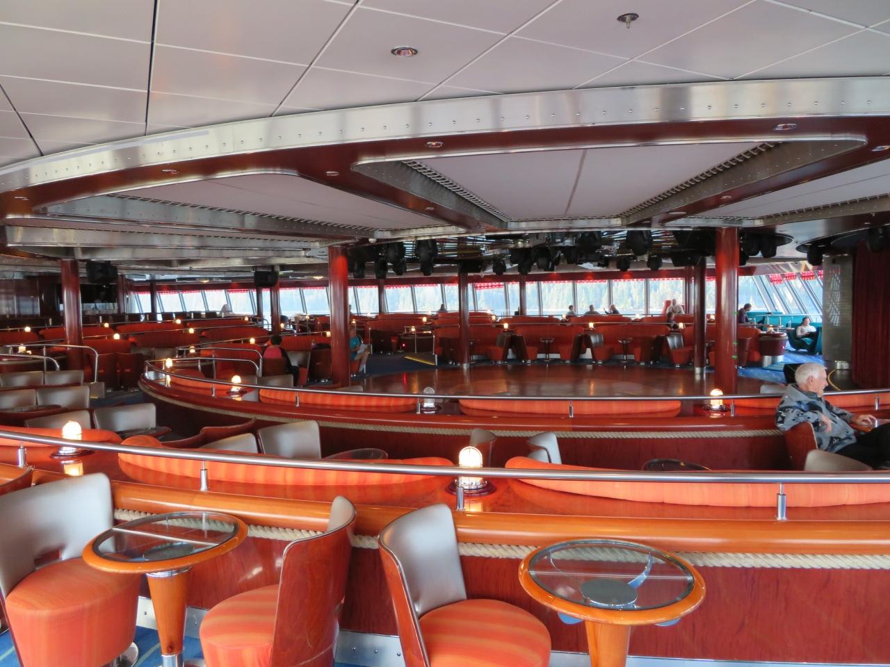 13階船首にあるスピネーカー(Spinnaker)ラウンジ Spinnaker:ヨット船首の三角形の帆ラウンジでは生演奏の音楽を聴きながら夜遅くまで楽しめる