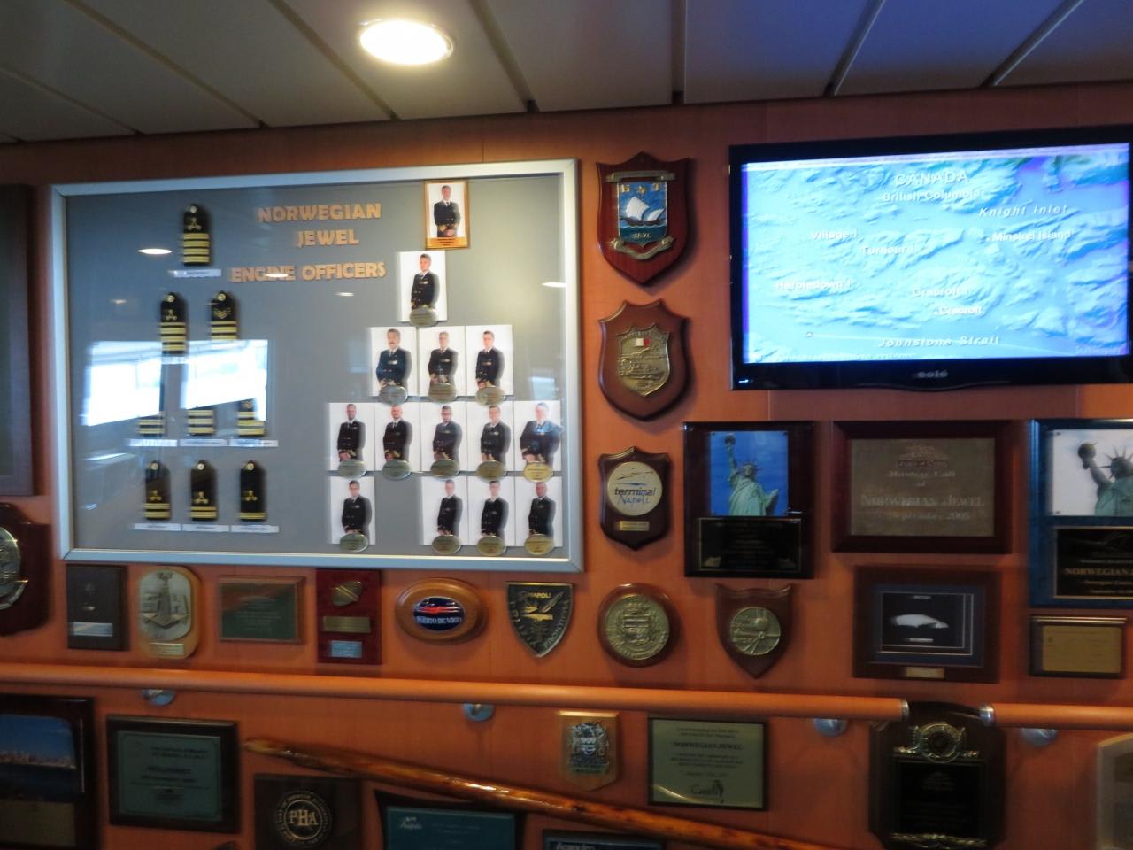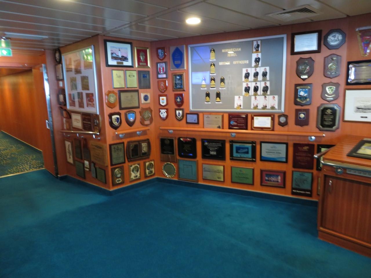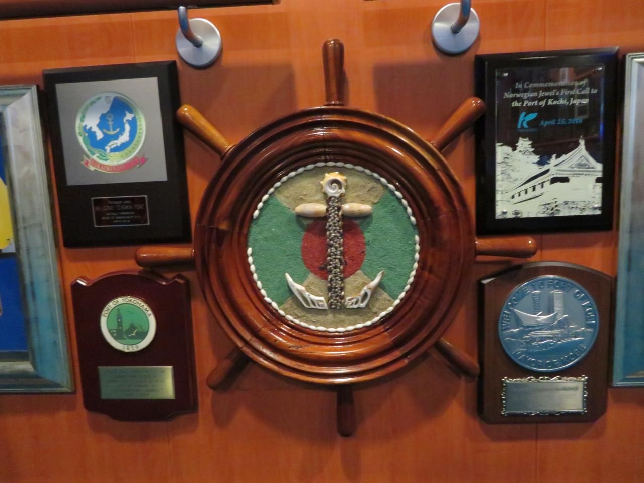 ブリッジ展望室に掲出の寄港した港から贈られた記念楯