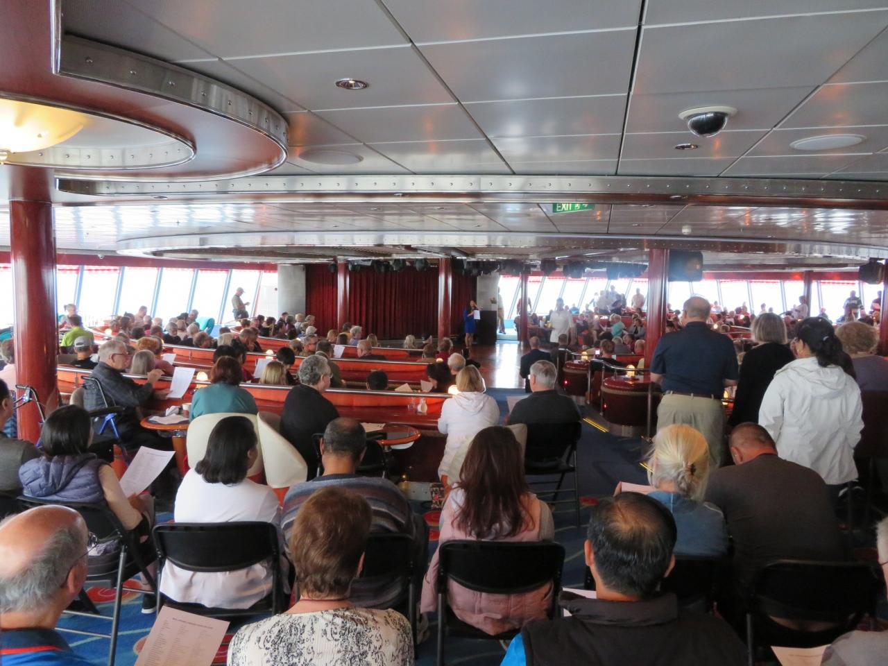 クルーも元気溌剌と業務に励み、船長を囲む会でも船長の挨拶スピーチもなく、ただ立って手を振って会釈しているだけ。クルーは自由奔放に活動しており、乗船客の殆どがシニア層でも盛り沢山の催しで夜遅くまで一緒になって楽しみ、シニアを盛り上げて活を入れてくれる。