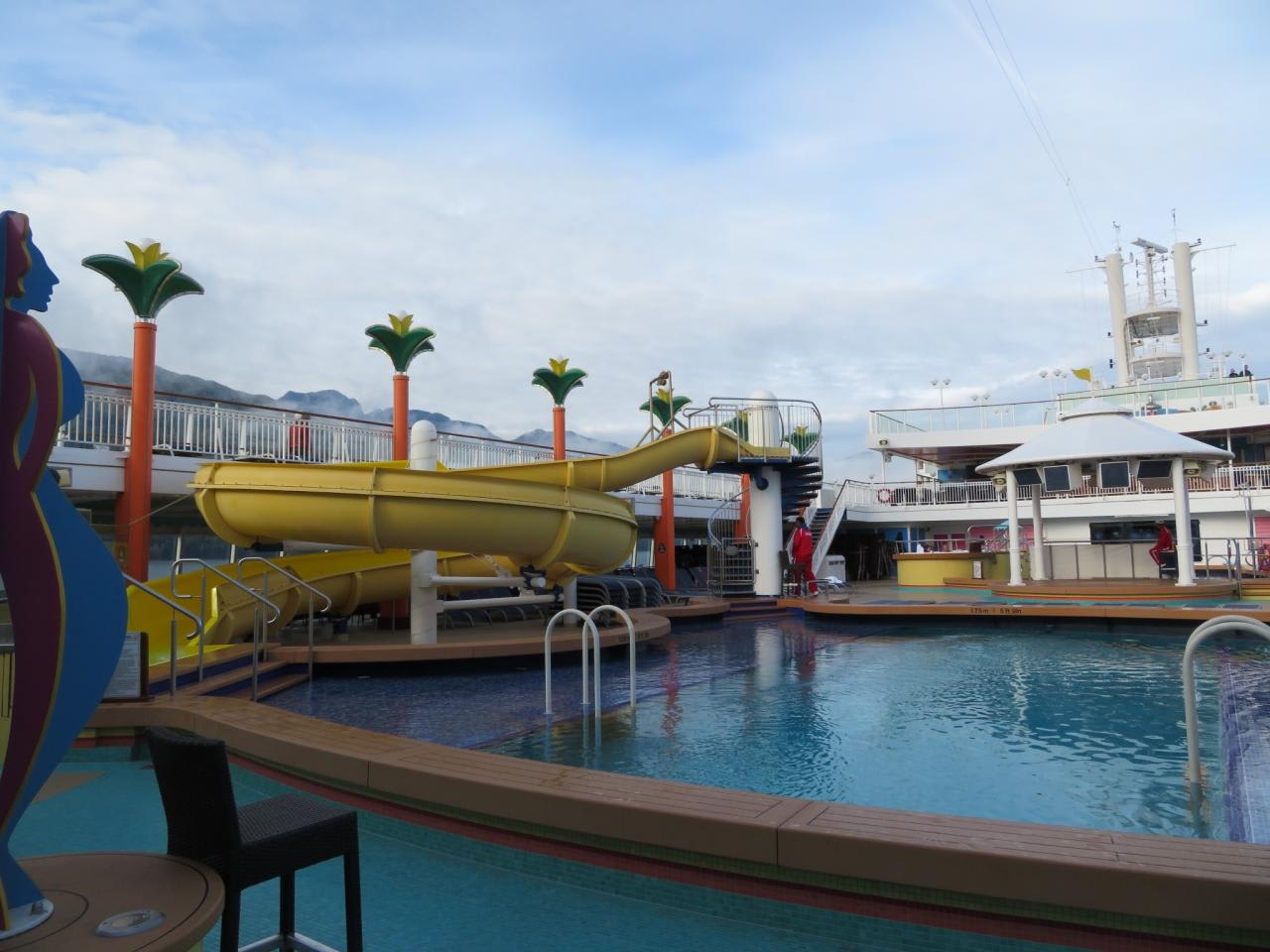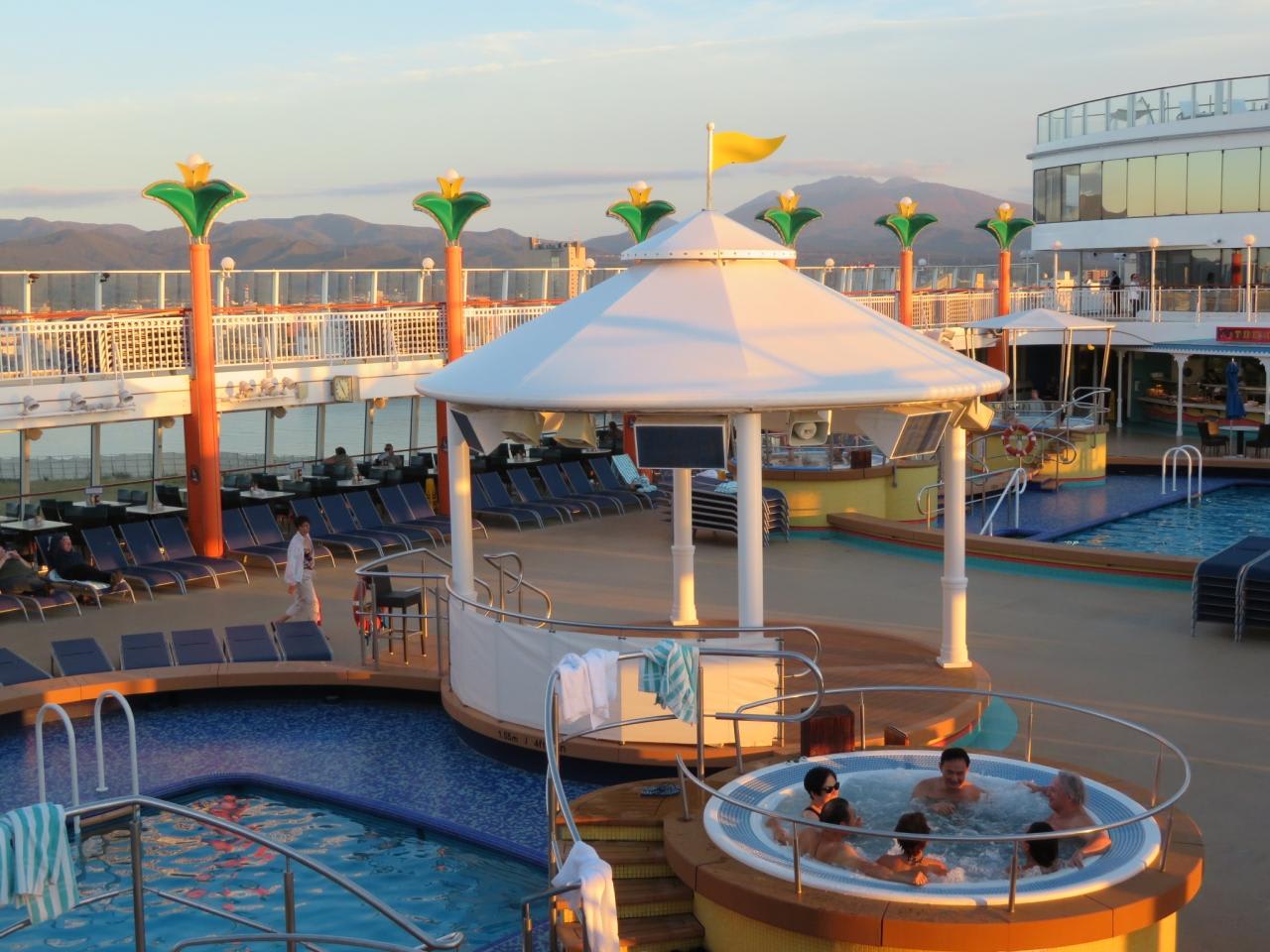 北太平洋の海を航行するクルーズと言えども寒さを感じずに屋外のプールやジャグジーに入っている人がいるのには感心。
