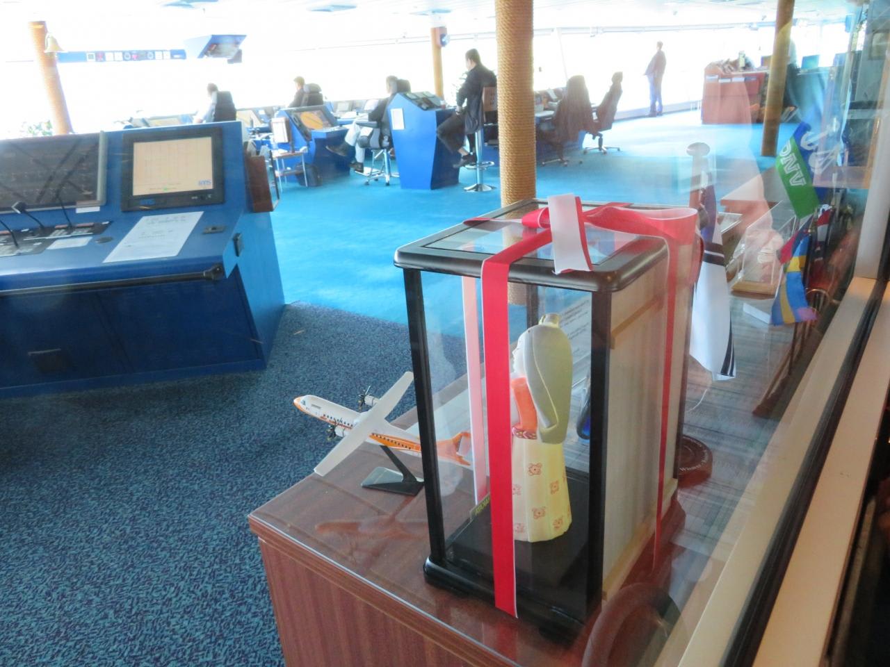 日本の港から贈られた人形やモデル飛行機が飾ってある広々としたブリッジ。