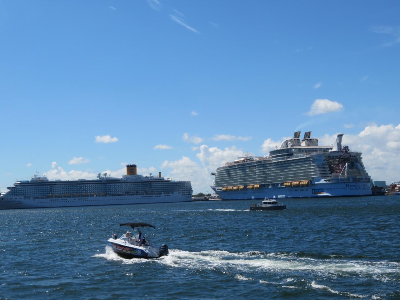 左からコスタデリチョーザ、ハーモニー・オブ・ザ・シーズの前をモーターボートやクルーザーが行き交います。