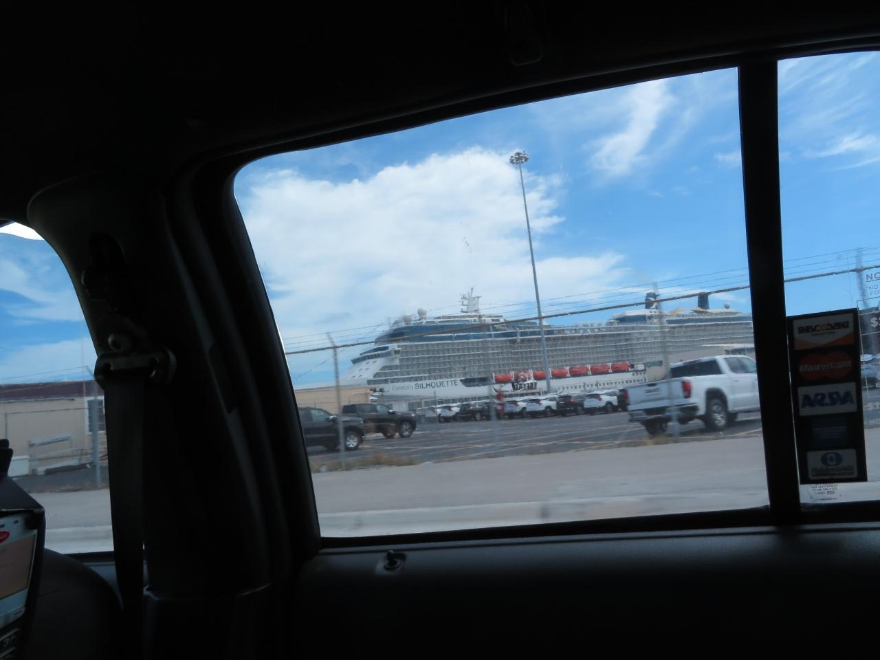 これから乗船するニューアムステルダムがタクシーの車窓から見えてきました。