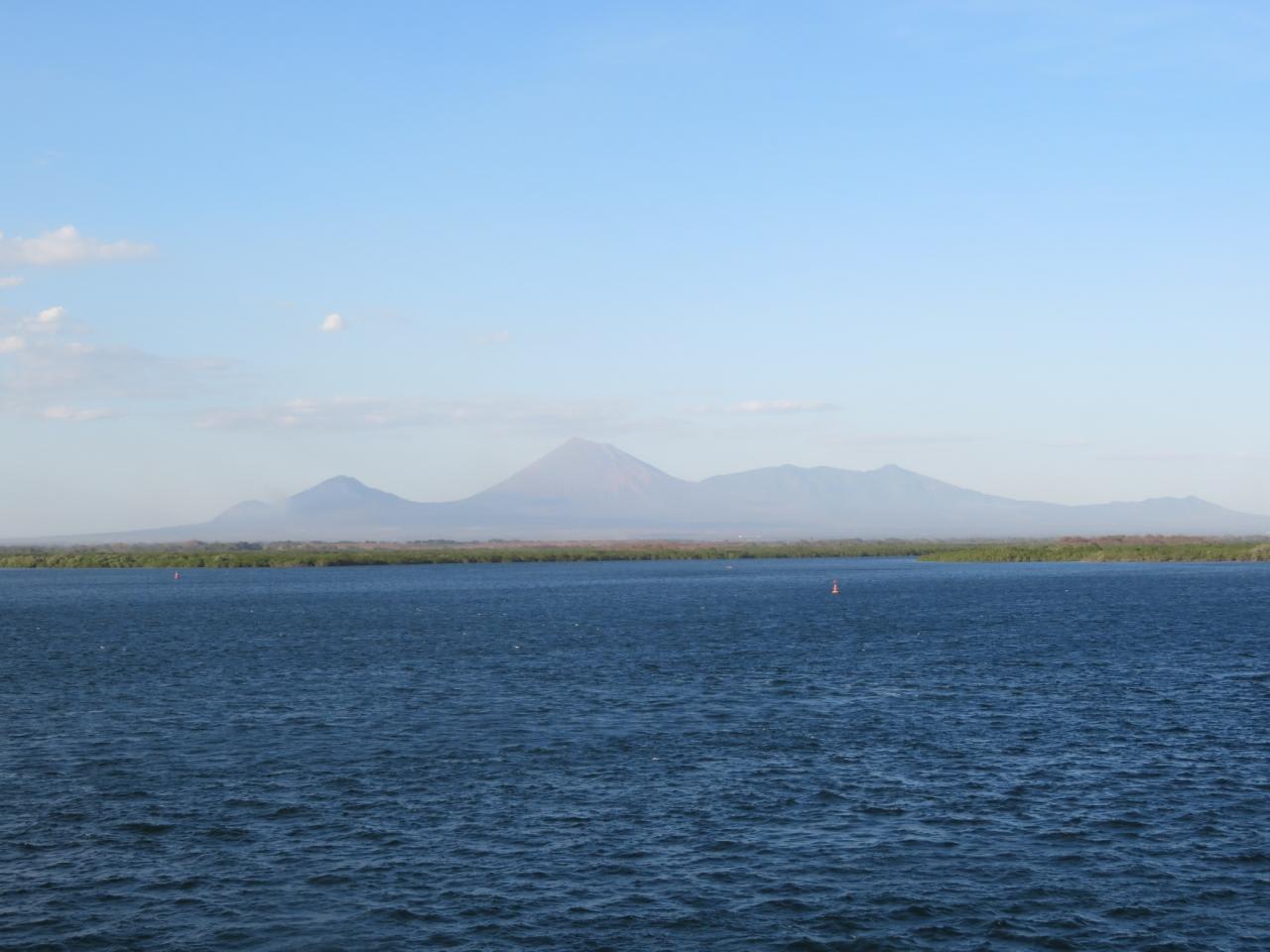 午後5時に出港。デッキから眺めるモモトンボ火山帯ニカラグアの東西の海岸地帯は熱帯平野となっており、中央にモモトンボ火山が属する山岳地帯になっています。明日はグアテマラのプエルトケツアルに寄港します。