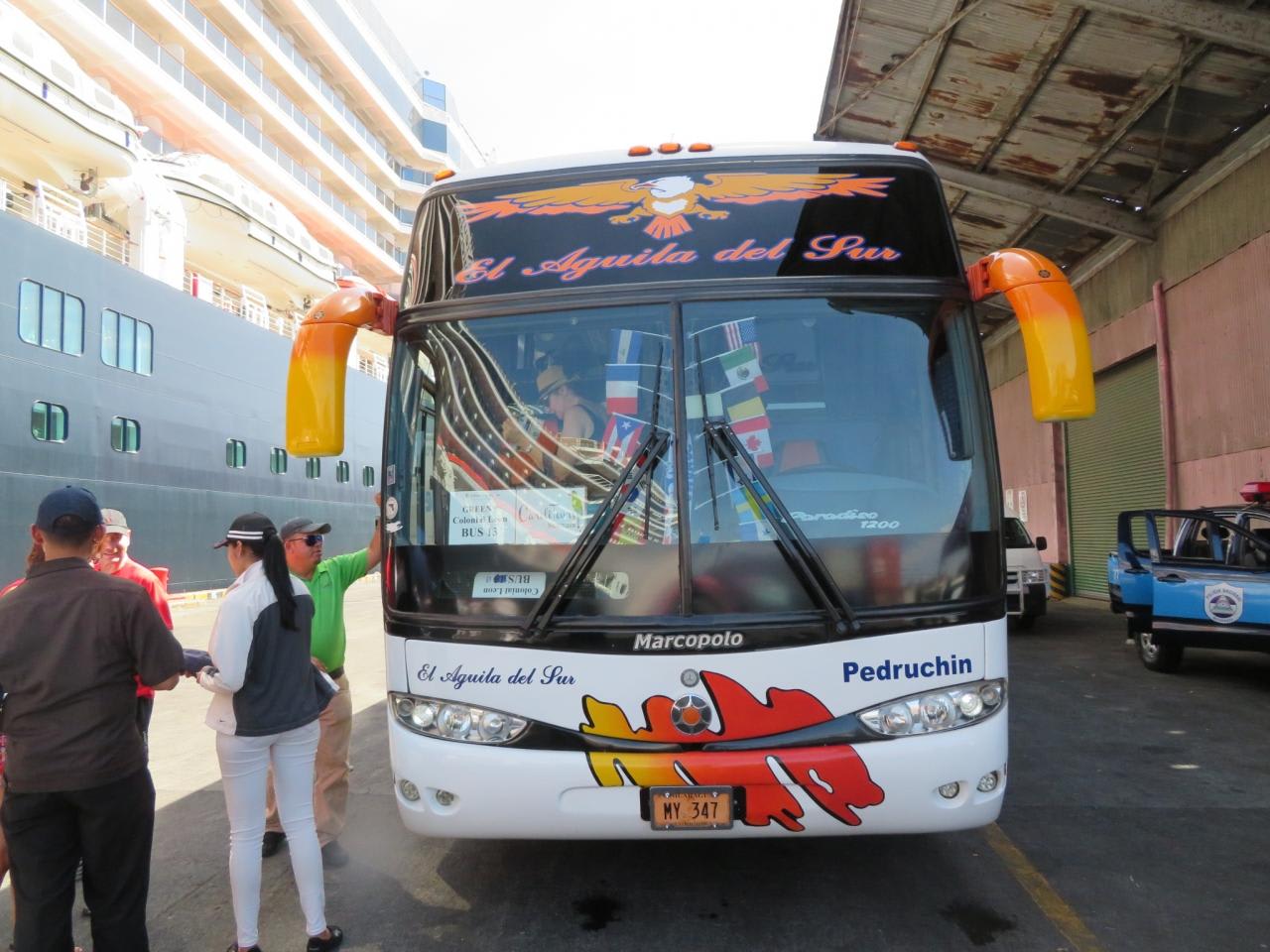 レオンの町からコリントの港に帰って来ました。ニカラグアの観光バスもバックミラーが大きい!
