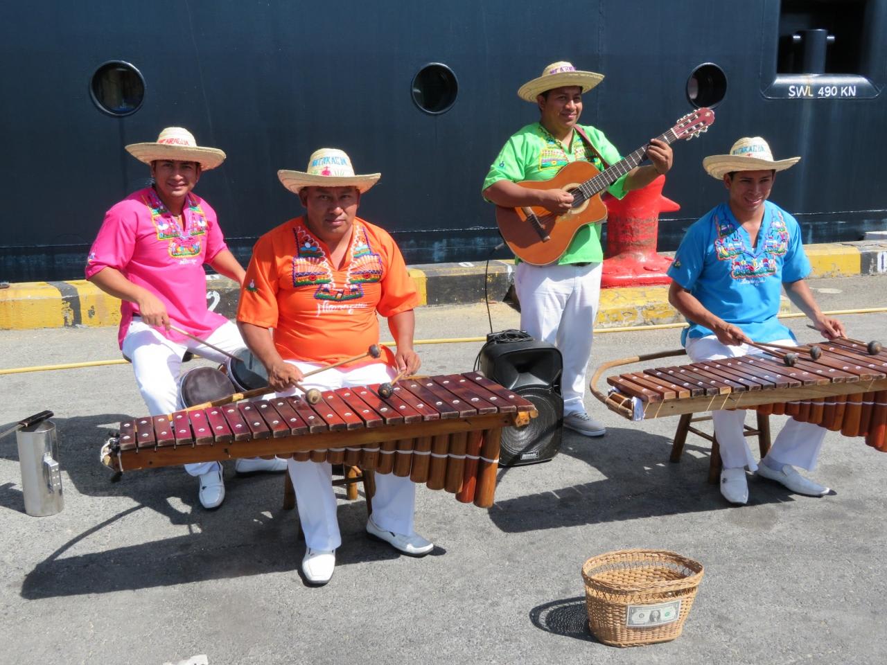 コリント港ではカラフルなシャツを着てマリンバ演奏で歓迎されました。