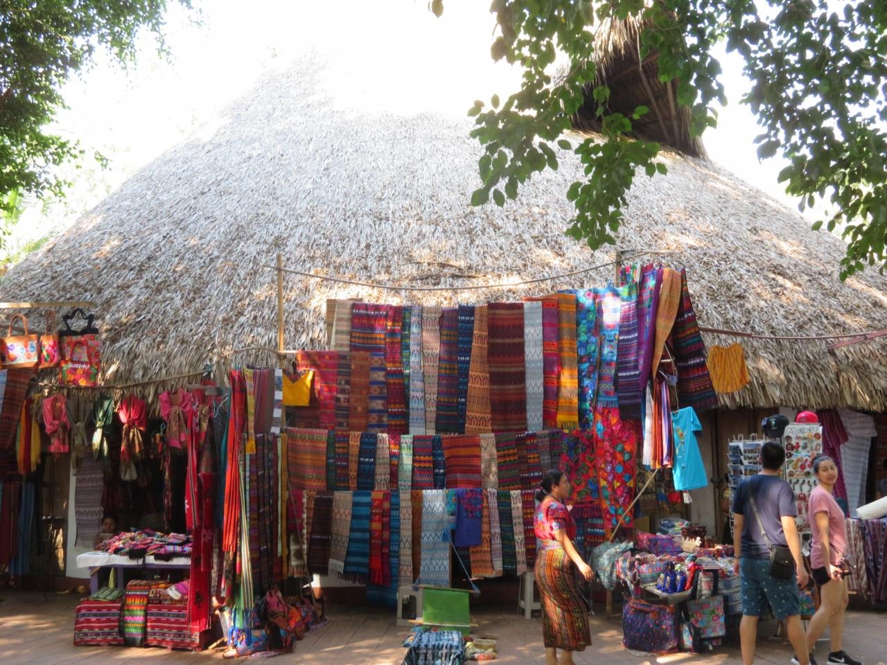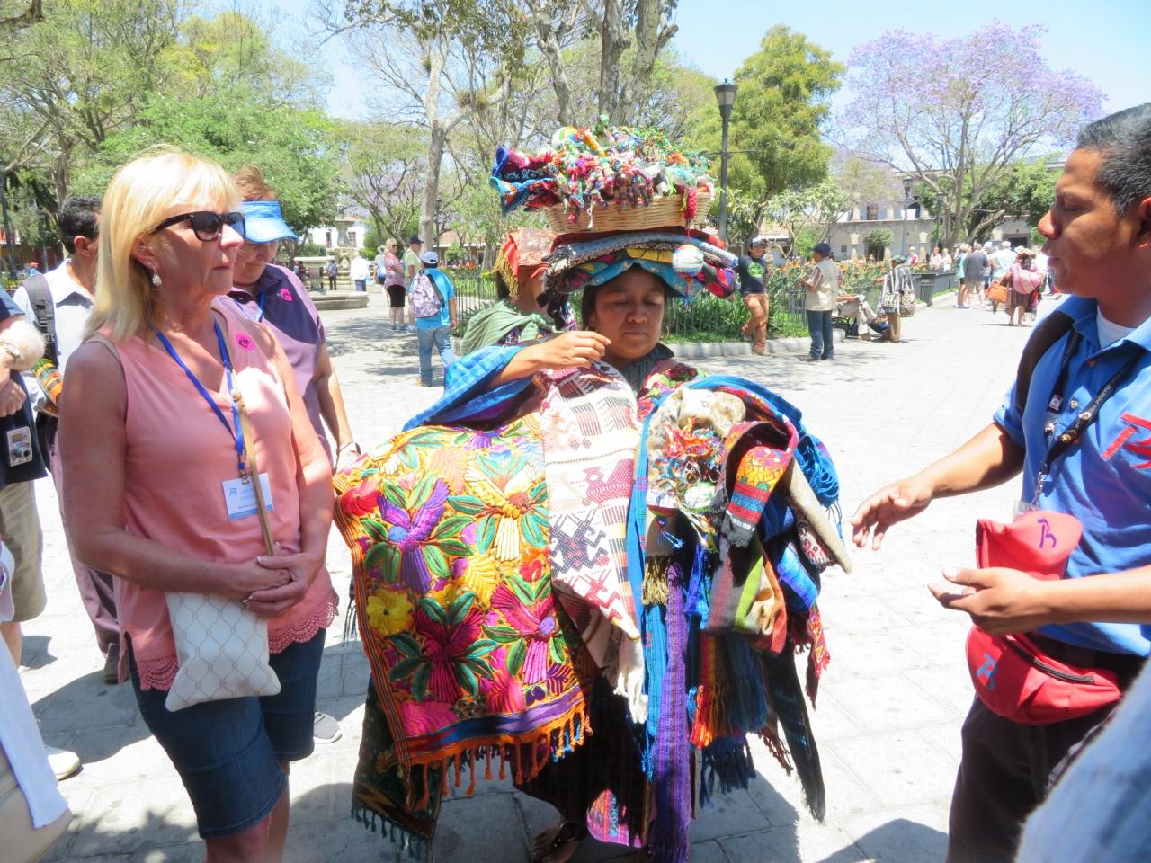 中央公園では観光客目当てに色彩豊かな民芸品を地元女性が売り歩く