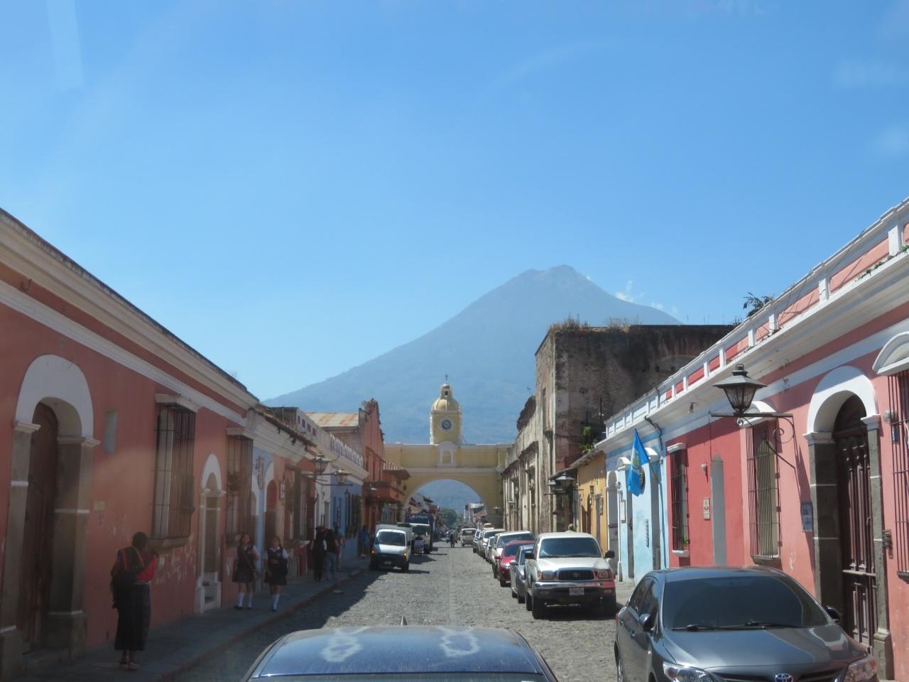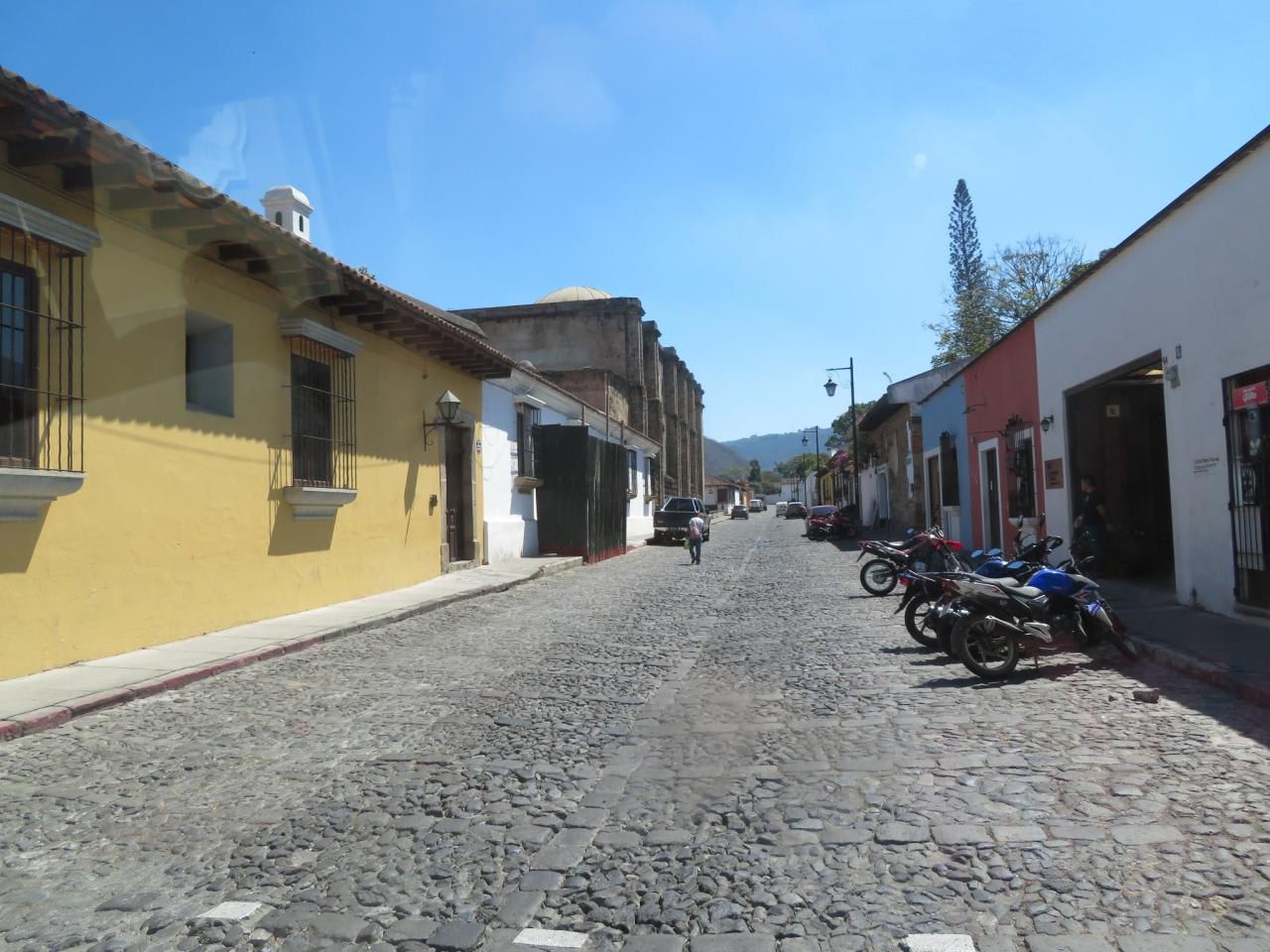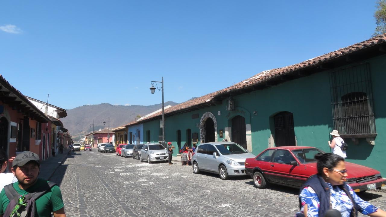 アンティグアの街並み家屋は道路ぎりぎりに建てられており窮屈な感じですが、壁の色合いに癒されます。