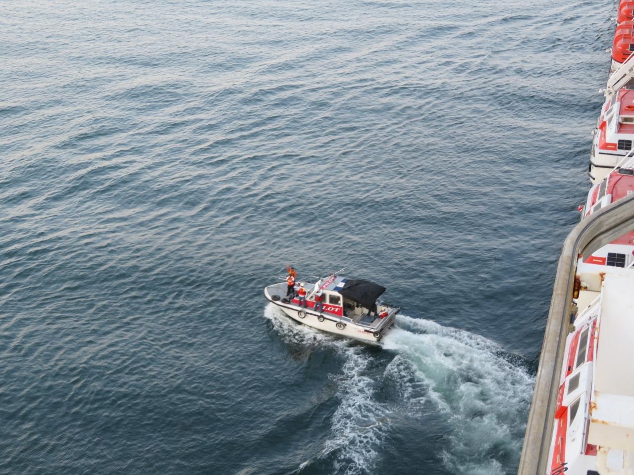 午後5時に出港。防波堤の手前でパイロットボートが近づいてきてパイロットが降りて行きました。明日午後にはメキシコのウアトウルコに寄港します。