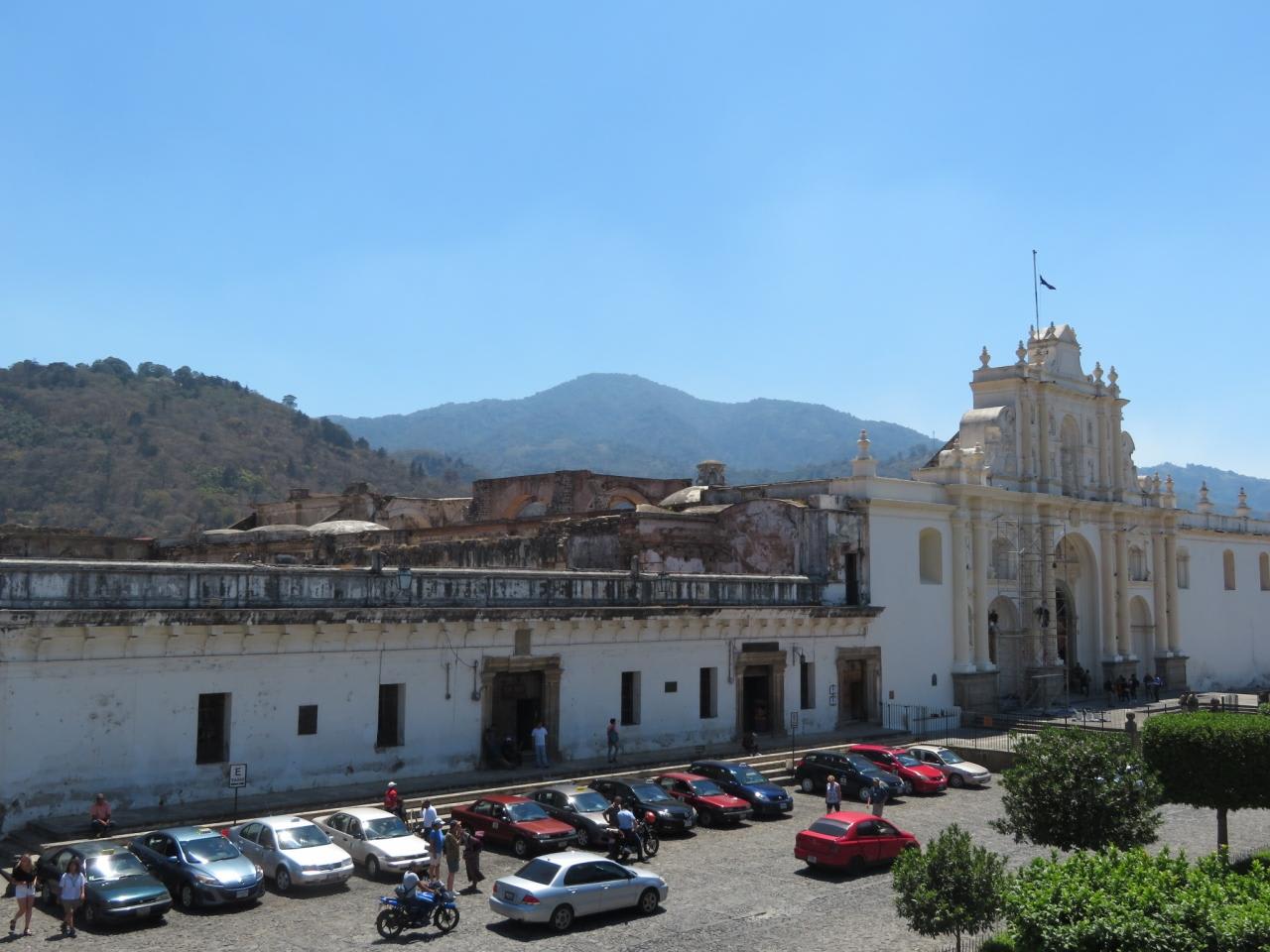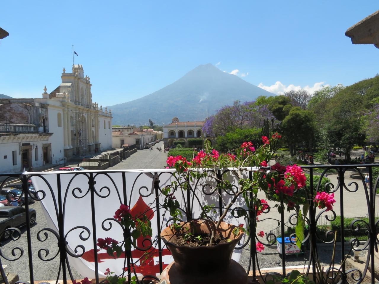 市庁舎の2階テラスからカテドラルとアグア火山を望むアグア山は1,500m位の高さに見えますが、富士山とほぼ同じ高さ。