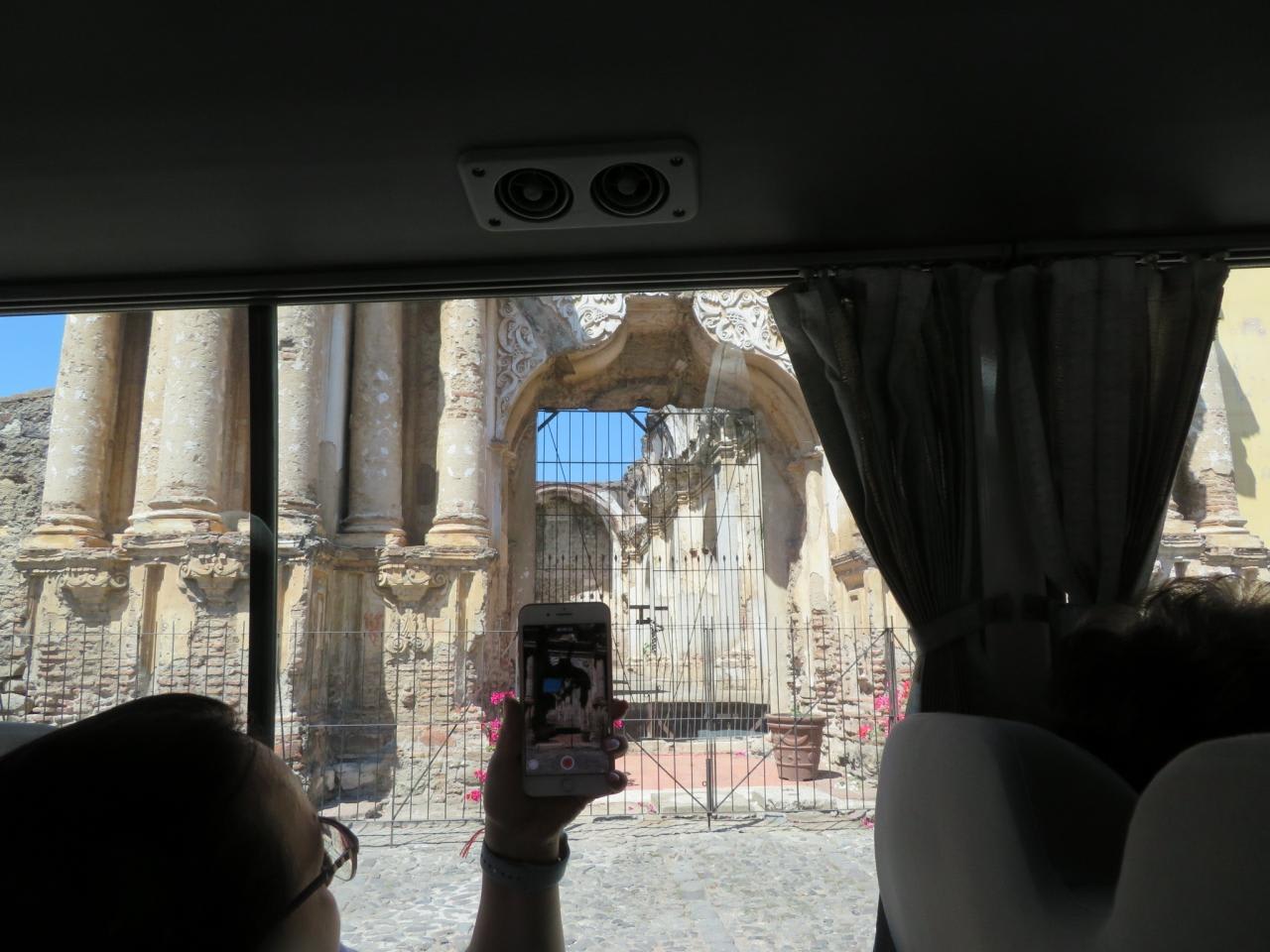 アンティグアの町は3つの火山に囲まれたコロニアル様式の美しい古都ですが、アンティグアに着いたら道路は狭くなり、大型バスでは通れないのでマイクロバスに乗換え、ガタゴトと石畳の道路を走り、スペインの植民地時代の遺構などがある異国情緒満点の街並みを散策しました。
