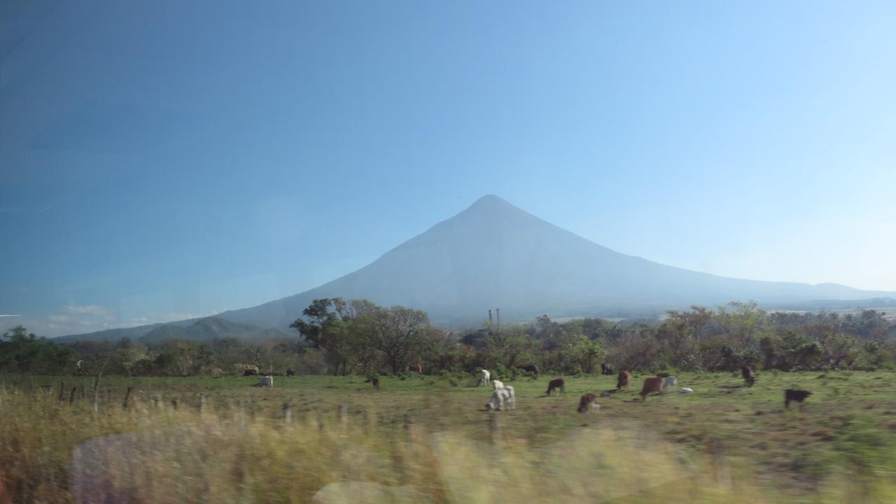 車窓から眺める開聞岳によく似た円錐形のアグア火山(3,760m)。標高は富士山とほぼ同じです。草原には牛が放牧されのどかな景色