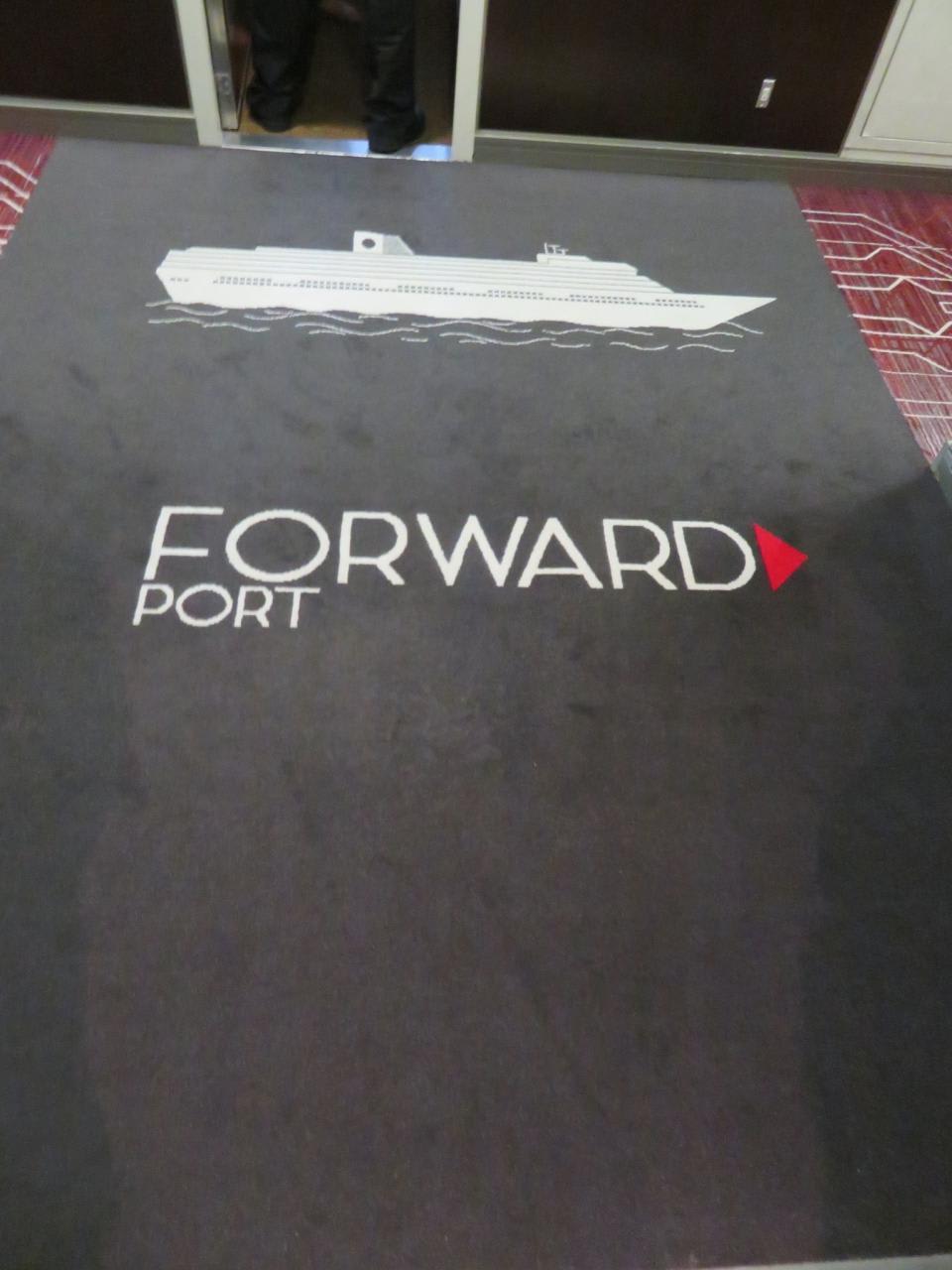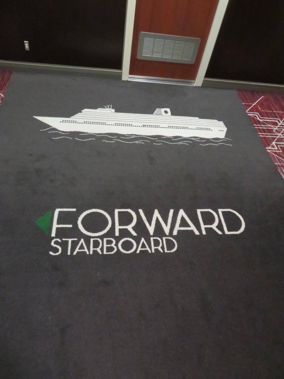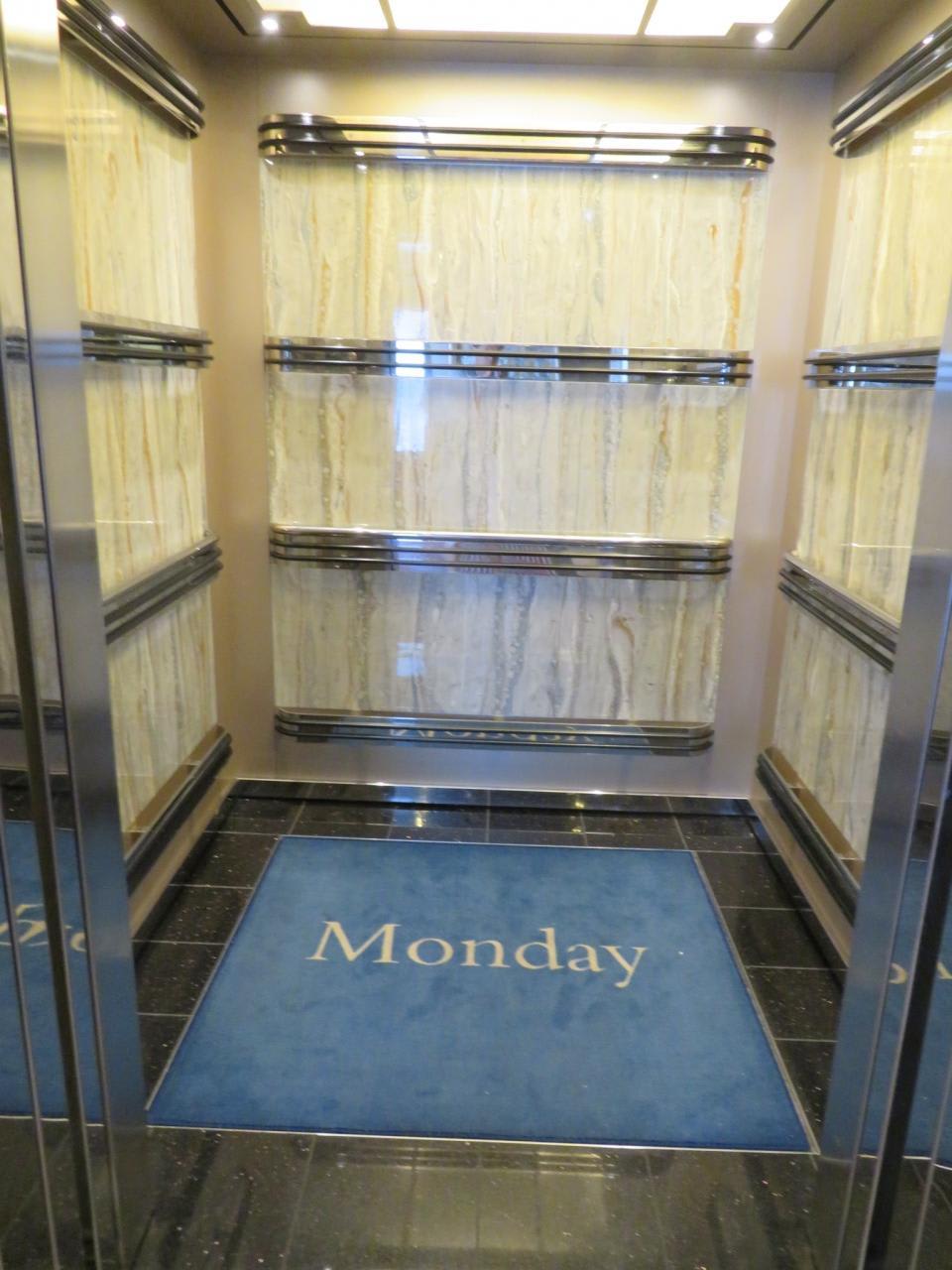 長期クルーズが多いHALならではのエレベーター内の曜日を表示するフロアマット。乗船客はこのフロアマットを見て今日の曜日を認識します。