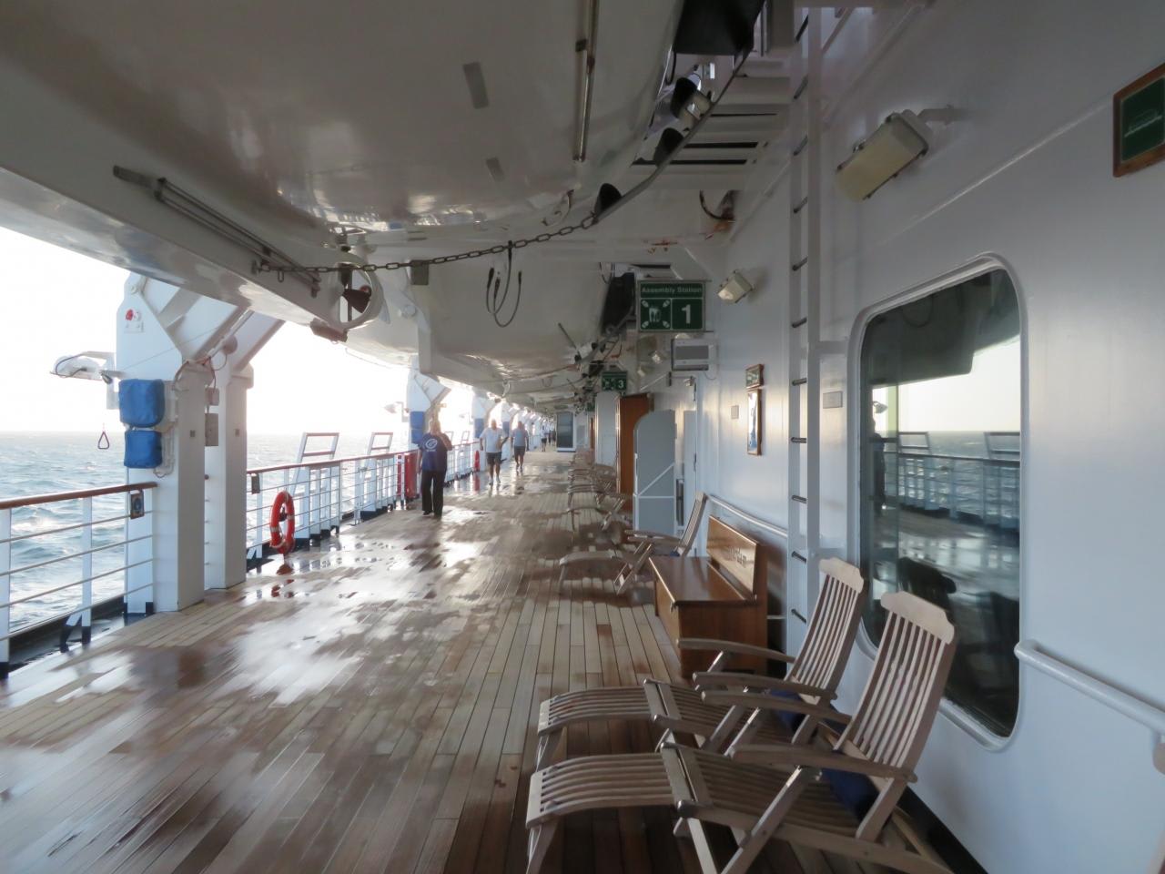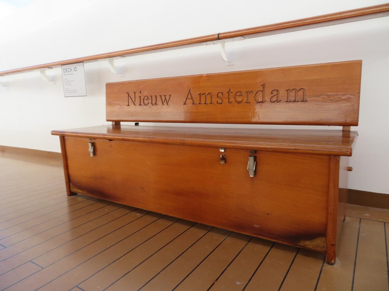 デッキにはNIEUW AMSTERDAMと彫り込んだ素敵な椅子が各所に配置されていて格調高い。チェアの中に何が入っているのか開けて見てみたら掃除道具が入っていました。