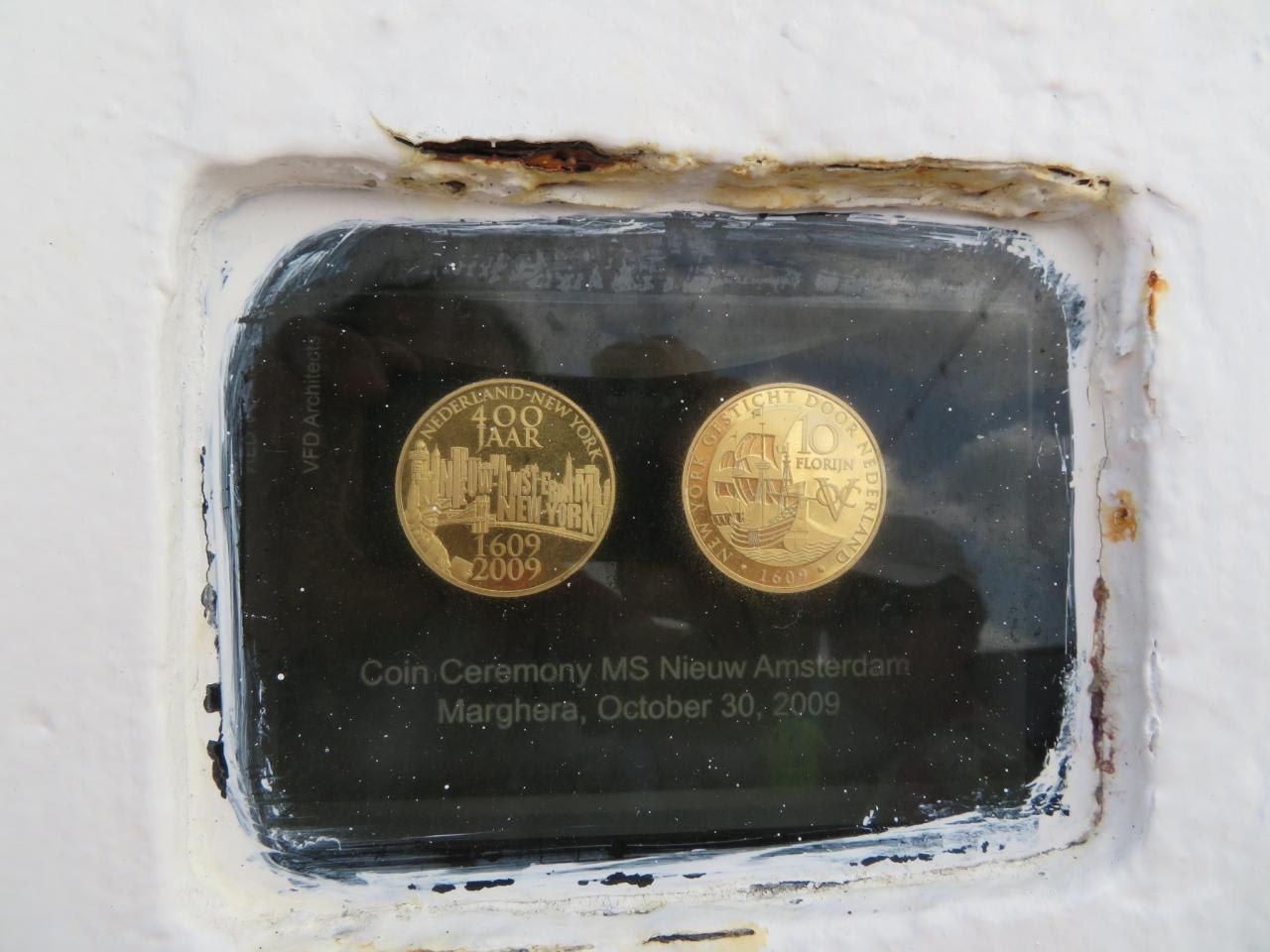 乗船客が上がれる最上階デッキ前方部分に設置の硬貨入り銘板。昔ながらの伝統に則り、稀少なコインを船体に溶接して幸運を祈るものであるらしい。