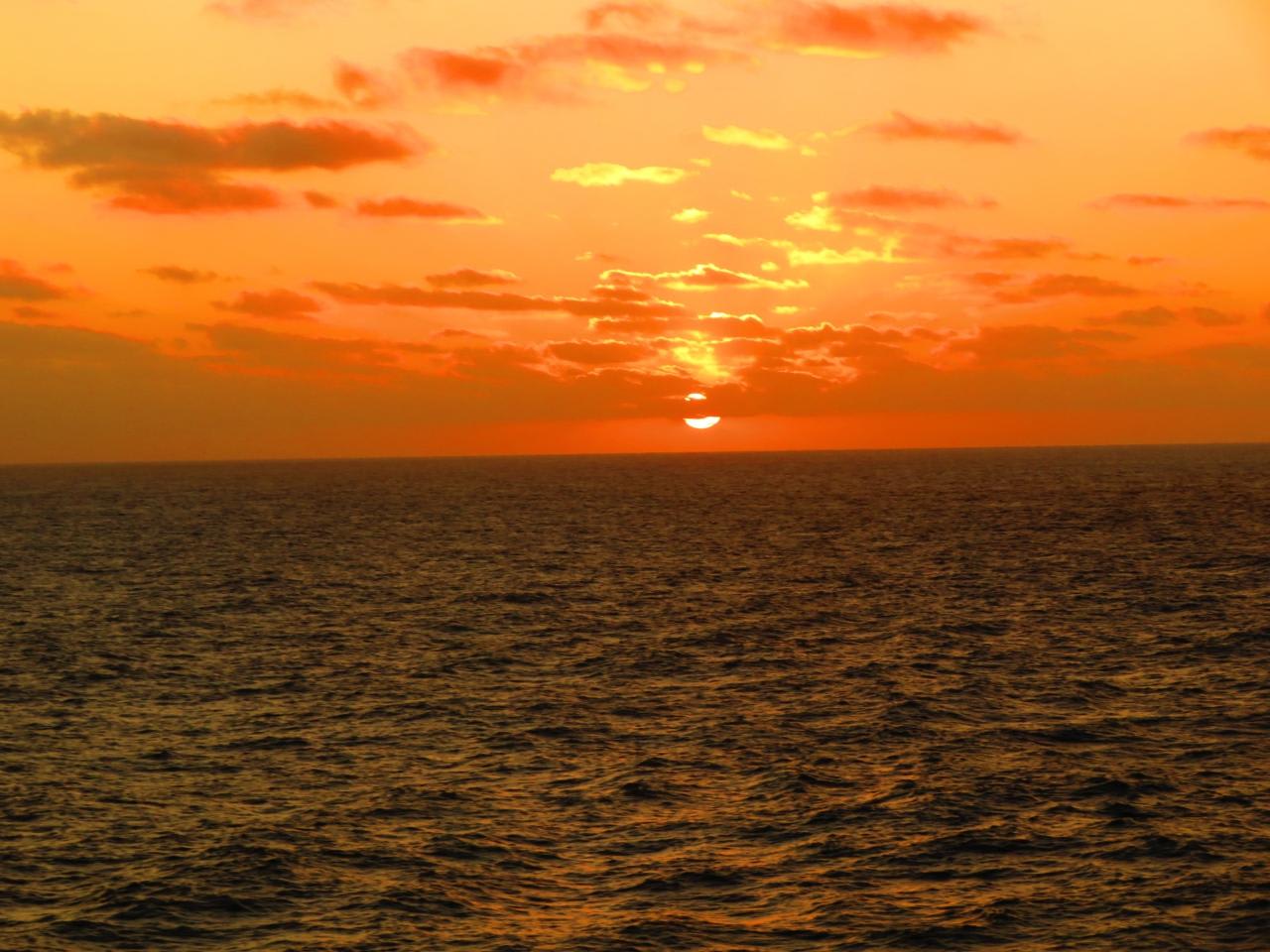 クルーズ最終日前日の夕陽明日は下船しなければなりません。まるで住み慣れた居心地の良い老人ホームを追い出されるような気分になります。船内にいれば上げ膳据え膳で食べ放題。7ヶ国を周遊し船上から大海原を満喫したり、ショーや音楽を鑑賞したり、クルーズの醍醐味を感じた15日間のクルーズでした。