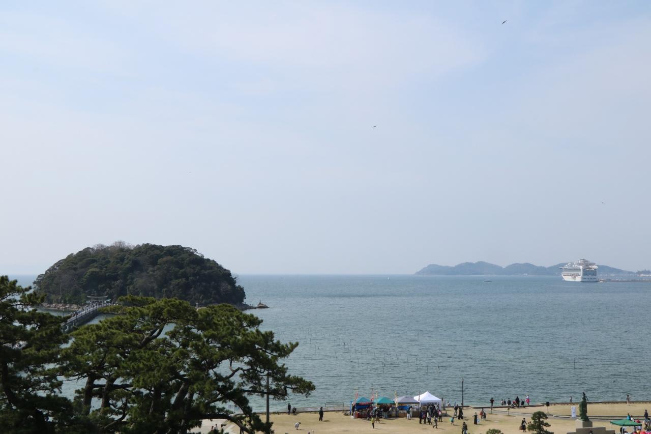 竹島園地俊成苑では飲食などの出店が並んで観光客が押し寄せていました。