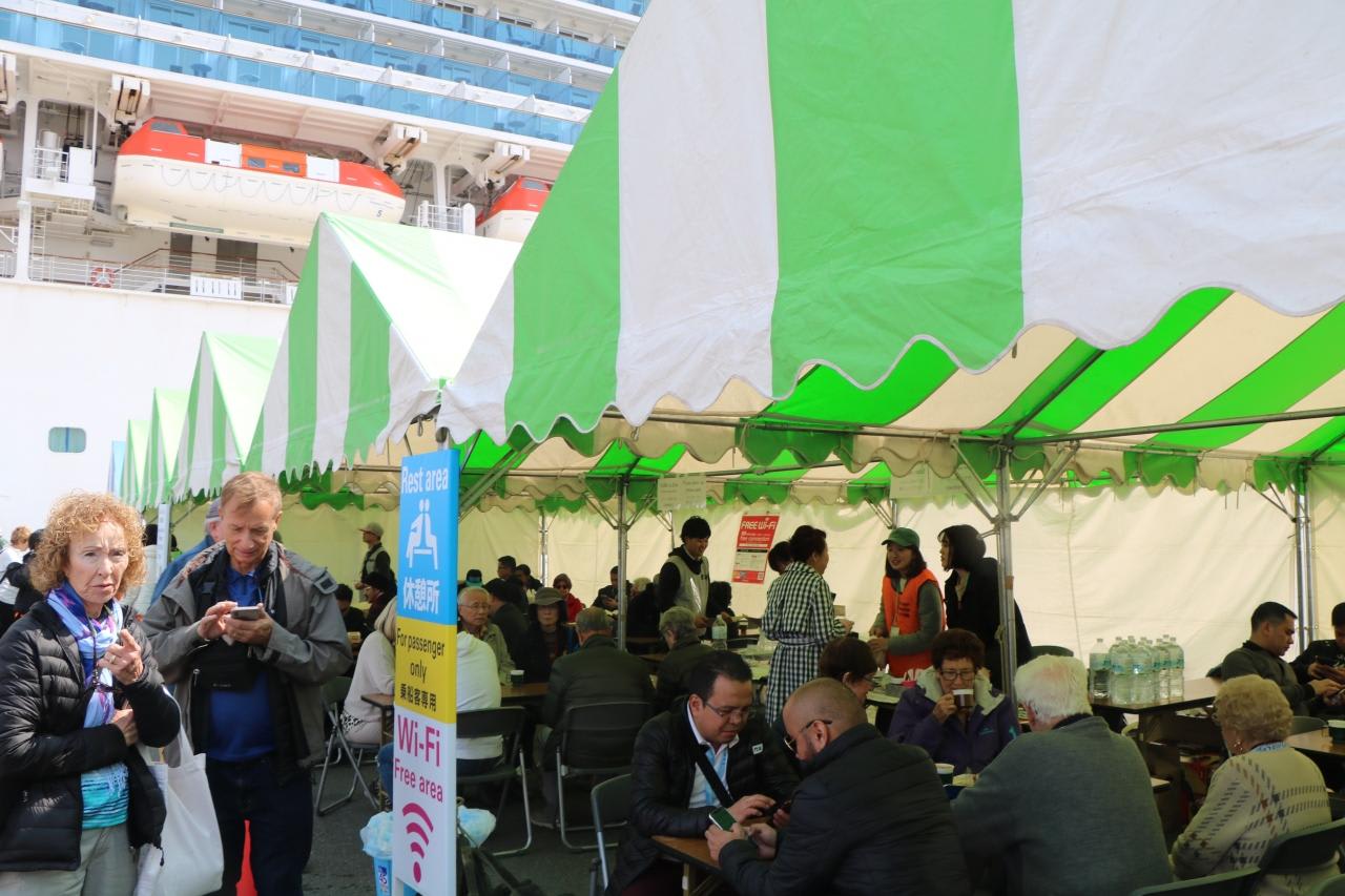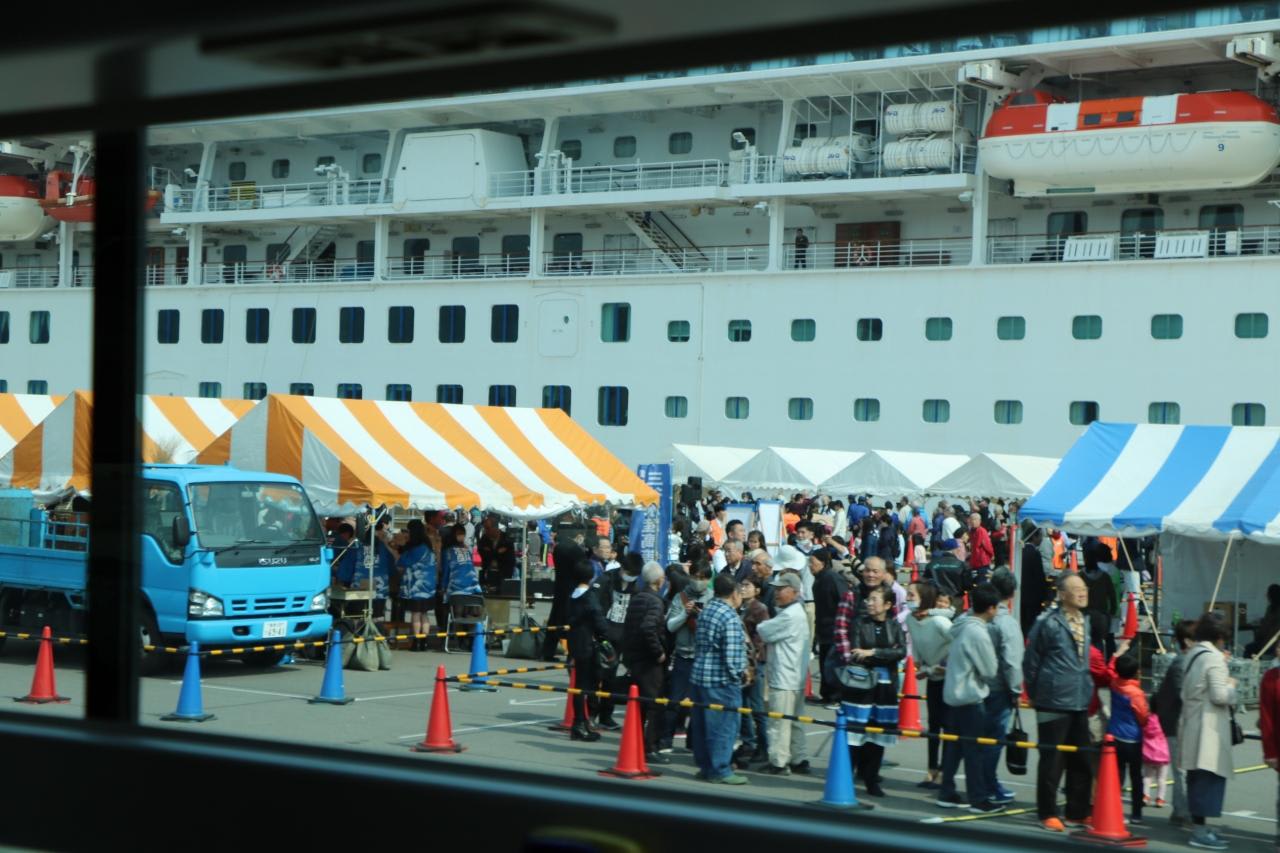 シャトルバスに乗って11号岸壁に行ったら見物客でいっぱい。これまで見て来た日本の寄港地の港の雰囲気と違います。