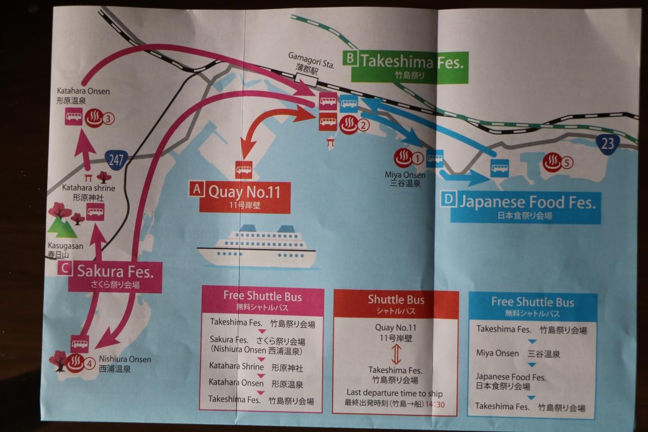 11号岸壁から竹島祭り会場と西浦温泉、形原温泉、三谷温泉行きの無料シャトルバスが運行され、日帰り入浴受入可能施設も案内。