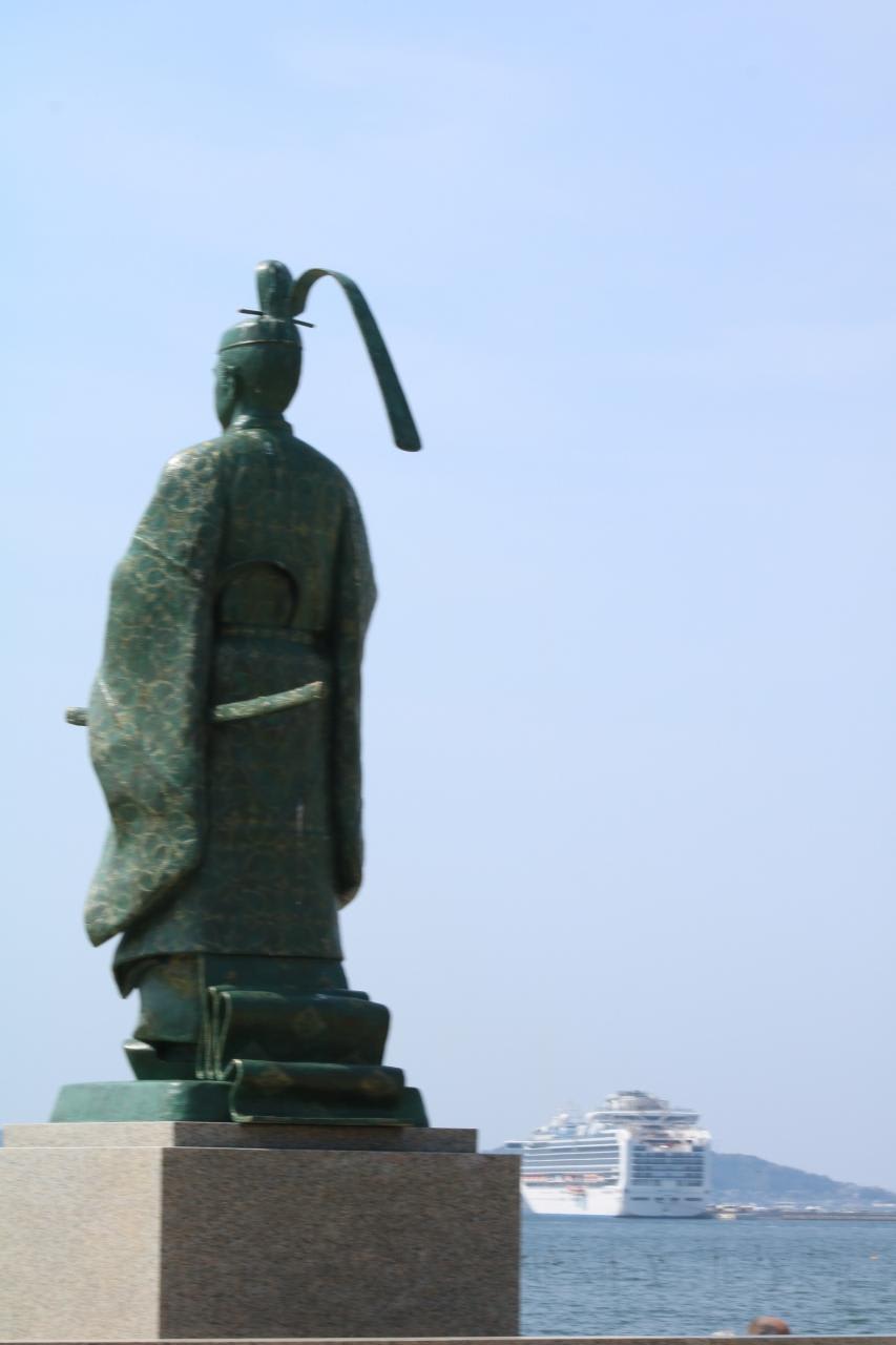 三河の国の国司として蒲郡を開拓し、平安時代の代表的歌人で百人一首の詠人でもある藤原俊成の銅像とダイヤモンドプリンセス