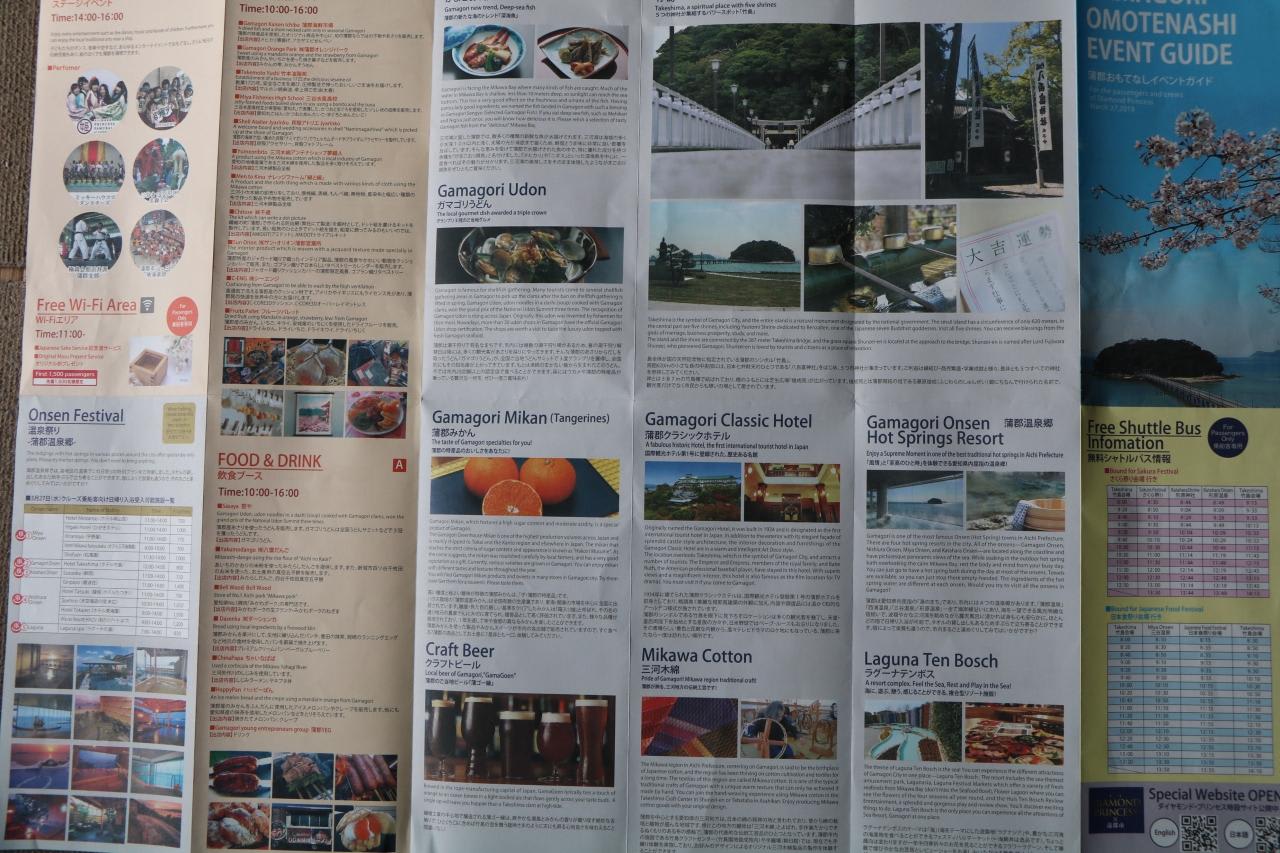 11号岸壁で配布されていた観光ガイド日帰り入浴、グルメ、観光などの記事がきめ細かく英語と日本語で記載されおり、今迄に筆者が訪れた日本や世界各地の寄港地の観光ガイドの中ではトップクラスの観光ガイド。寄港地でこのような観光ガイドが配布されたら乗船客も安心して観光できます。蒲郡市が誘致に努めた結果、ダイヤモンド・プリンセスは来年4月3日と11月12日にも蒲郡寄港が決まっているそうです。
