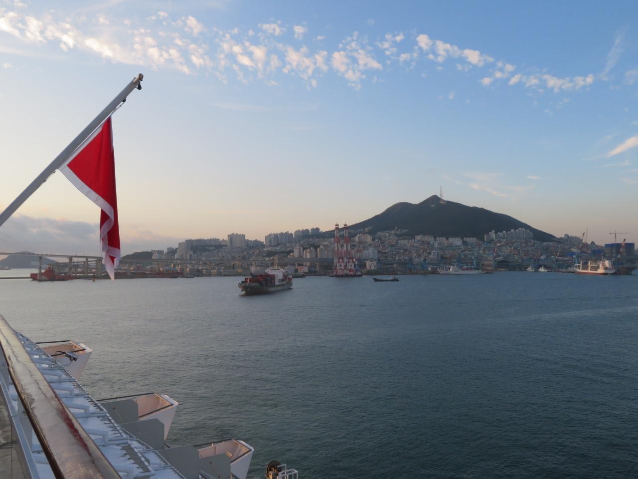 クルーズ5日目の朝、釜山の町並みと釜山港大橋が見えてきました。
