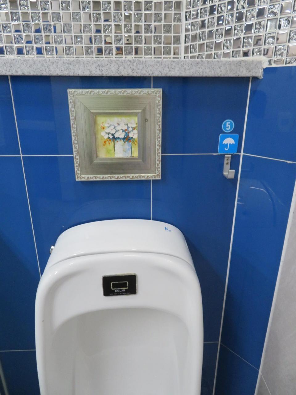 傘吊りもあり、男子用便器の上に額に入った花の絵が飾られて癒されます。