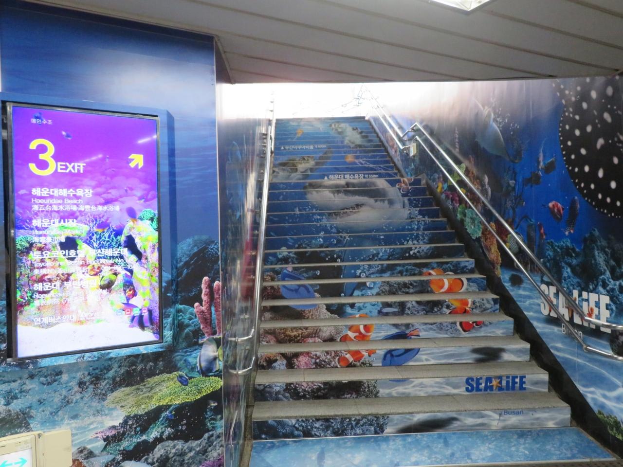 海雲台駅から地上に上がる階段にはカラフルな魚が何匹も描かれ、まるで水中にいるような感じ