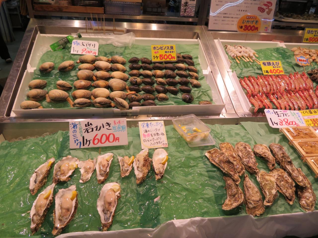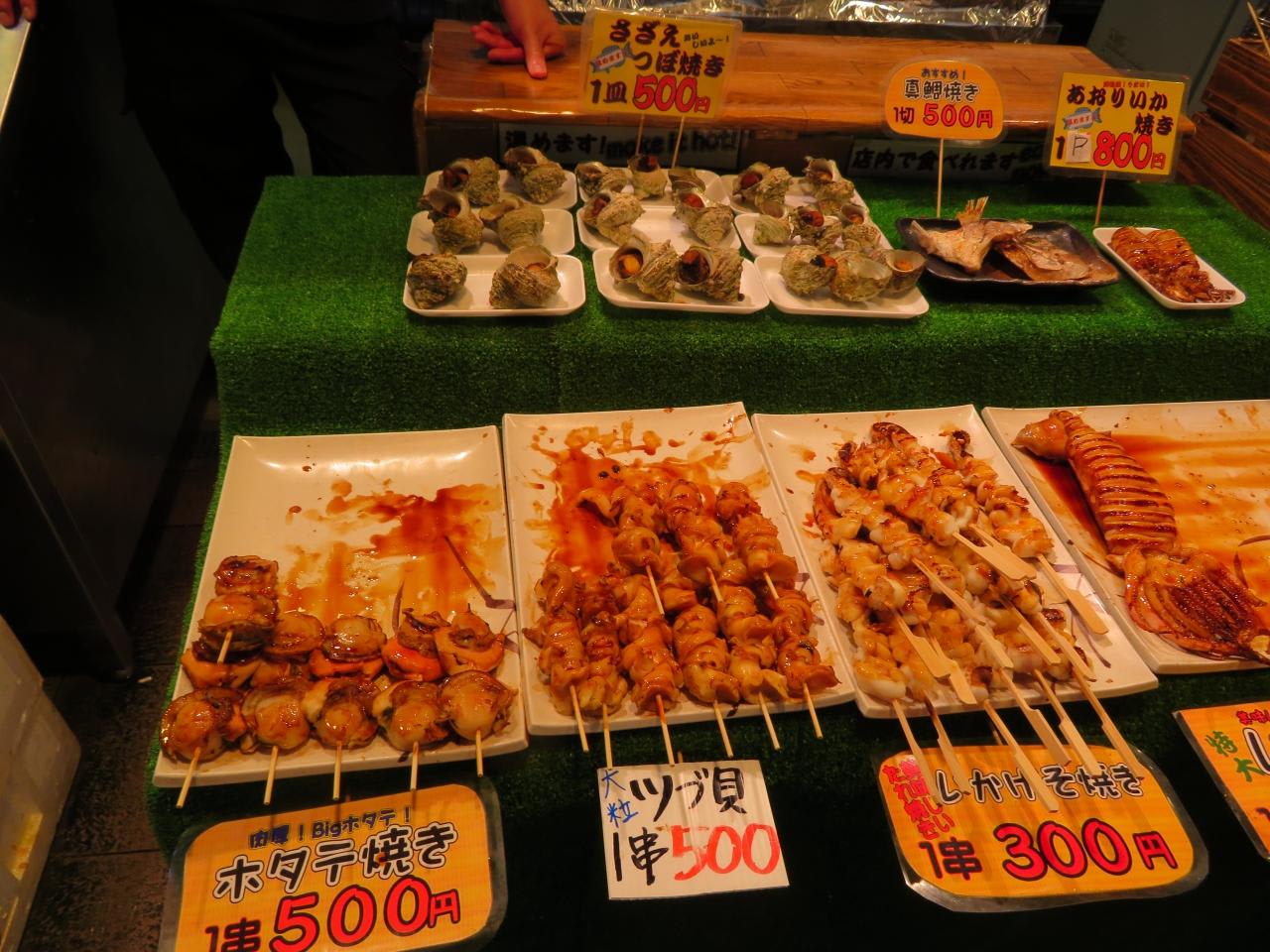 ホタテ焼き(500円)やさざえつぼ焼き(500円)など美味しそうな物が食欲をそそります。