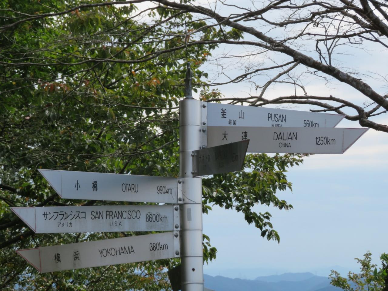五老ケ岳山頂(海抜300m)から釜山まで560km、横浜まで380kmなどと記した標識