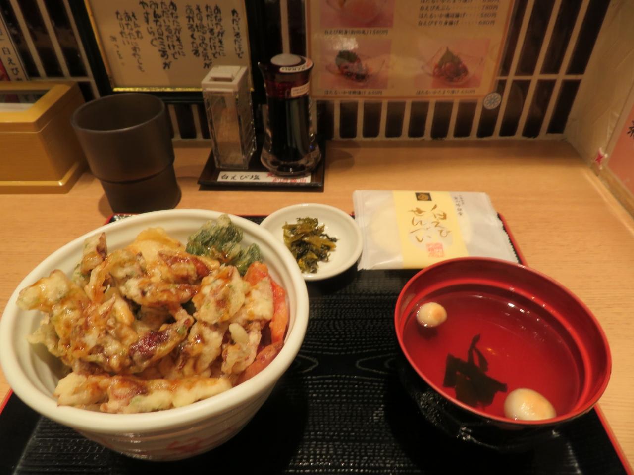 長蛇の列はきっと美味しいに違いないと白えび亭の列に並び、「ほたるいか天丼(980円)」を食べました。
