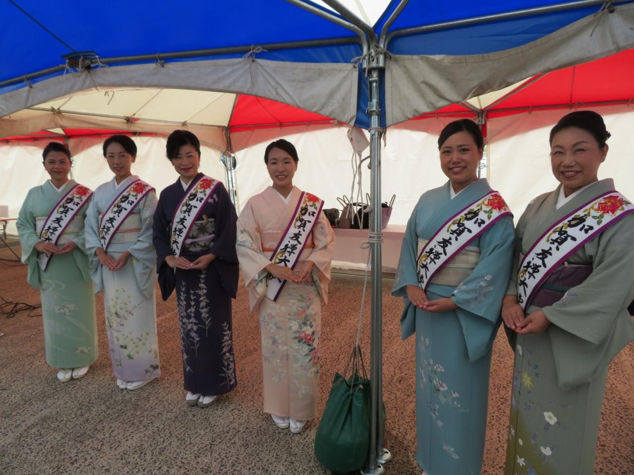 金沢港では加賀友禅の着物を着た加賀美人が出迎え