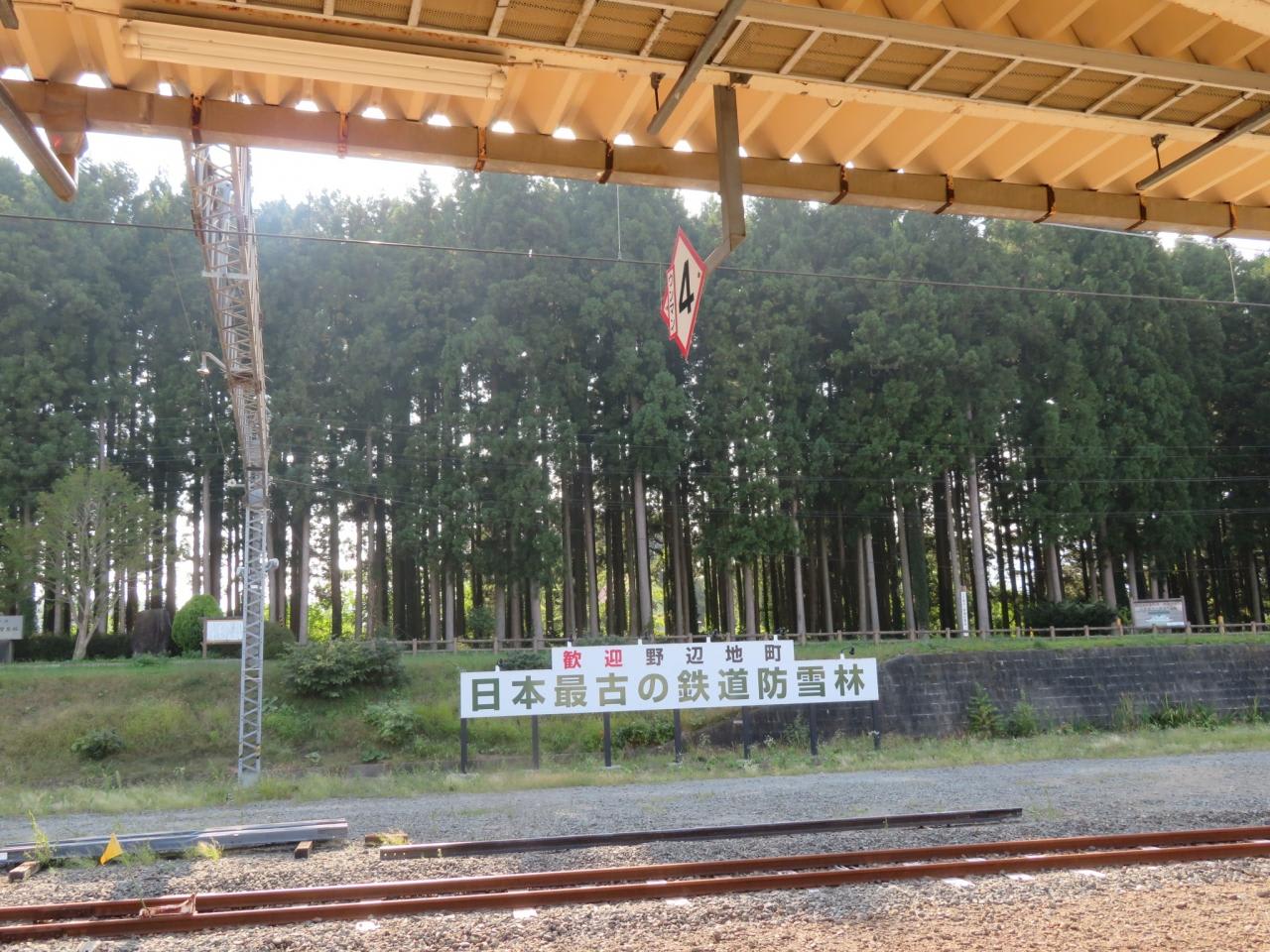 日本最古の防雪林(野辺地駅停車中の車内から撮影)