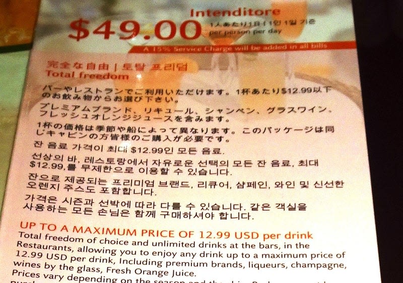 最初からオールインクルーシブドリンクパッケージのついた船室を予約すべきと思います。