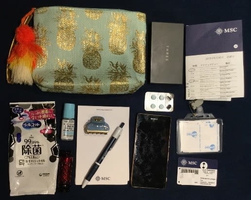 船内で過ごしていた時、ポーチがとても便利でした。ここではポーチに入れて船内で持ち歩いていたものをご紹介します。男性も女性も小ぶりなポーチがあったほうが便利だと思うので参考にしてください。