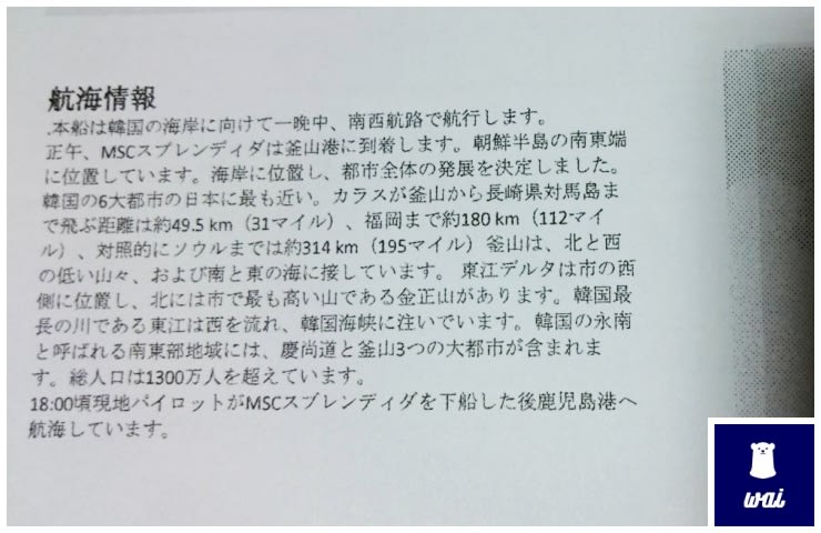 (別記事でまとめようと思っているのですが、船内有料wifiに申し込まなくても船内アプリだけは使えると聞いていましたが、結局下船まで接続できなかったので、アプリではなくこの紙のプログラムで情報をチェックしていました。)