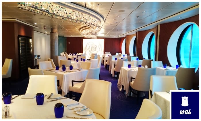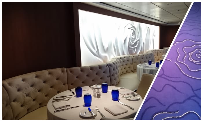こちらはアクアクラス(スイートと一般の間のクラス。午後に軽食のサービスがあったり、ミストサウナの「ペルシャガーデン」に無料で入れるなどの特典があるらしい)専用のダイニング「ブルー」。テーマカラーの青とバラが印象的な空間です。アクアクラス専用ダイニングということで、メインダイニングの「メトロポリタン」よりも小ぢんまりしています。