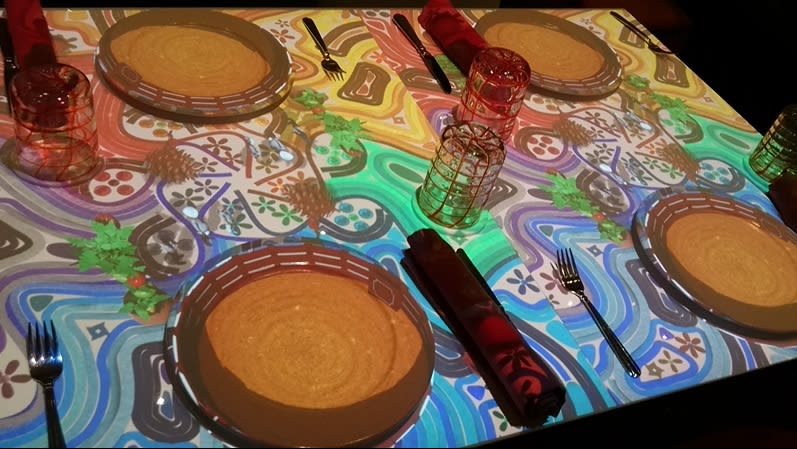 カラフルなグラスに真っ白なお皿とクロス。ここに小さいシェフが料理を作る姿が投影されます。音楽と映像の演出が楽しい「クイジーヌ」のプロジェクションマッピングのデモ映像はこちら。
