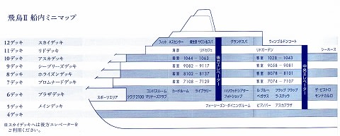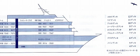 このクルーズ、乗船前から結局3桁のオーダーでオーバーブッキングしていた というような話も聞いていました。 もともと飛鳥2は、クリスタルハーモニー時代からわざわざ定員を減らして いるわけで、収容できないオーバー分では無いのですが、乗船後、船内で流れ ていた噂によると、850人ほど乗っていたそうな.... ※ この項、あくまで船内で流れていた噂ですので、軽く読み飛ばしてください。