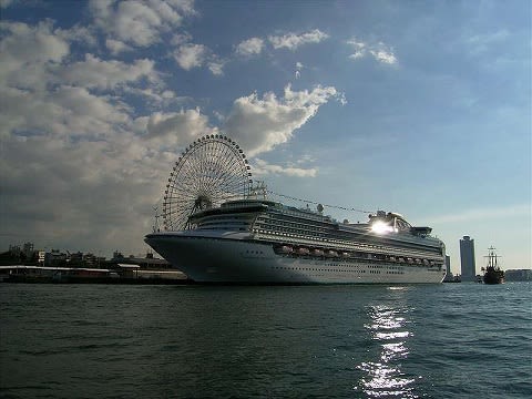パステルカラーに塗装された、海桜、下駄というよりサンダルという感じですね。天保山、昔、サンタマリアという観光船に乗り込んだような覚えがあります。ダイヤモンドorサファイアリンセスの後ろの小さな船がそうでしょうか。