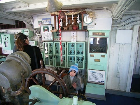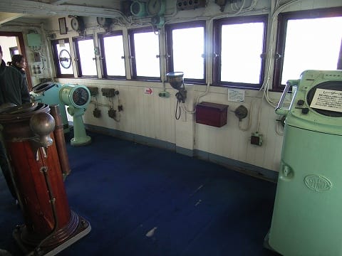 ブリッジへとコースは続きます。北太平洋の荒波を横断するために当時としては最新鋭の装置が備え付けられたそうです。乗務員の安全への願いが、奉れている「氷川神社」の神棚に象徴されています。