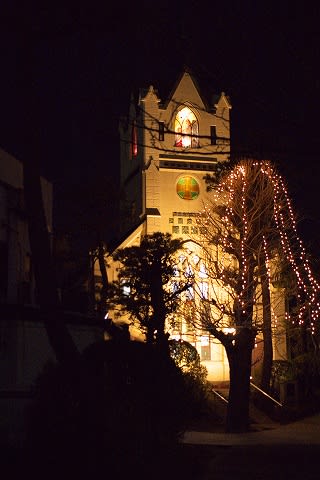 バスの駐車場へ引き返す途中で見かけた、鎌倉教会のライトアップ。