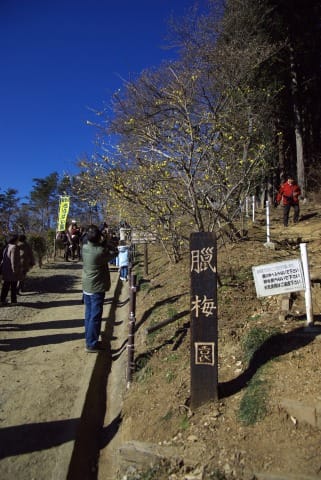 宝登山頂 ロウ梅園について 山頂にあるロウ梅は三種類。早咲きの素心は、香りが良く花芯部も黄色なのが特徴です。 和ロウ梅は、基本原種で花芯部はで紅紫色でやや小型。満月は、素心ロウ梅から選抜された品種。花はより濃色の大輪。 和ロウ梅はひとめでわかりますが、素心と満月は「どこが違うの?」とちょっと首を傾げるかも。そんなときは、第一ロウ梅園(山頂駅からすぐのロウ梅園)入口にある、花の名前札をチェックしてみましょう。 宝登山(ほどさん)山頂に約2,000㎡の敷地に500株、2,000本が咲き乱れます。 各所にあるロウ梅園と比べて、宝登山頂 ロウ梅園の特徴は、関東一のロケーションを誇ることでしょう。標高497mの宝登山山頂から眼下に広がる秩父の町並みや、秩父のシンボル「武甲山」、鋸状の山容をした「両神山」など眺望抜群です。