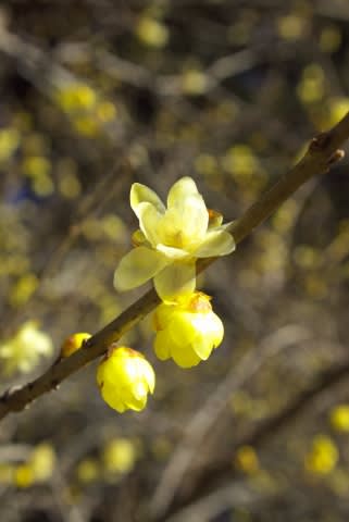 ロウ梅について 早春の陽光を浴び、透きとおるような淡い黄色の花を咲かせるロウ梅。 花の少ない時期に厳しい寒さに耐えながら、凛と咲く姿は美しいものですが、もう一つの魅力はなんといっても、その濃厚な甘い香り。英名(WinterSweet・ウィンタースゥィート)からもうなずけます。 名前の由来として、花がロウ細工のように美しいという説と、花弁の色が蜜蝋に似ているからという説、ロウ月(旧暦12月)に咲く花が梅に似ているからという説があります。 植物学的には、梅の仲間ではなく、ロウバイ科ロウバイ属で中国中部原産の高さ3〜4mになる落葉低木。まさに、冬に咲く花木の代表種と言えます。