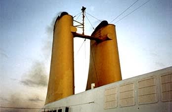 キャンベラのファンネルのアップは、初めて見た気がします。横の排気口から吐き出されるスチームは、何なのでしょう?キャンベラって、機関は蒸気タービンでしたっけ、その排気なのかな。