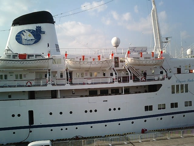 どこから撮影しようかと楽しみにしていたのですが、行かれなくて残念です。この船はどことなくエレガントな感じのする客船ですね。
