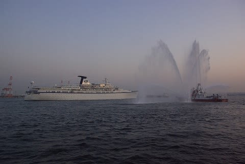 消防艇の歓迎放水すごいね。最後の方の写真等が凄い迫力ですごいわぁ。感動的でーす。有難う!!ボチ