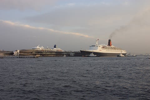 タグを従え、大桟橋に近づくQE2