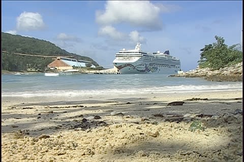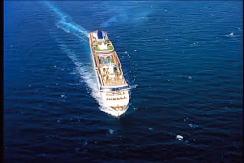 これまたマンションのような船ですね。船首から中ほどにかけてのマーキングがカーフェリーのようです。私もこんなに浜辺に近くて座礁しないものかな?と思ってしまいました。